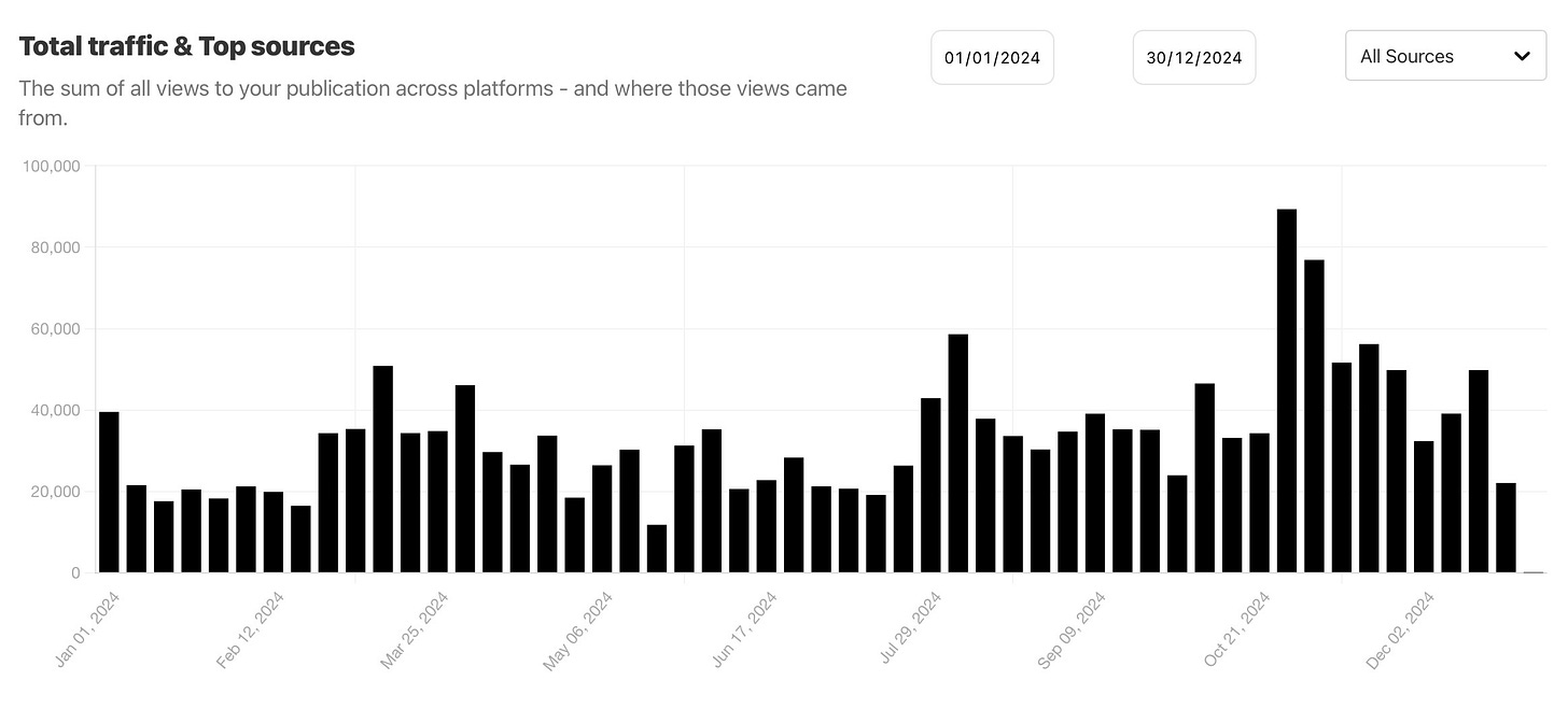 Over bezoekcijfers is het altijd de vraag of het verstandig is om ze te delen. Ik weet zelf niet wat goed of slecht is, want dit was het eerste fulltime jaar op Substack dus ik heb geen benchmarks. Hoeveel unieke bezoekers NN heeft gehad, is überhaupt niet na te gaan met de statistieken die Substack levert. Hieronder 2024 in pageviews, in een wat onlogisch opgemaakte staafdiagram.