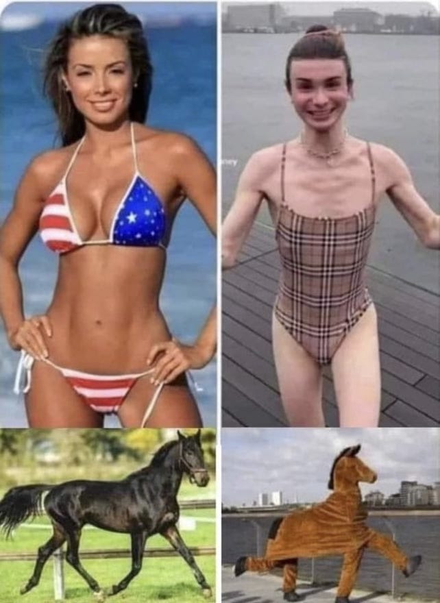 Fast forward naar nog eens een decennium later sinds Jordan miljardair werd. Nike laat “transvrouw” Dylan Mulvaney paraderen in een sportbh (en Anheuser Busch produceert bierblikjes met zijn gezicht er op), omdat het er kennelijk niet meer toe doet wat je kan, maar wie je zegt dat je bent. En omdat het “dapper” gevonden wordt om als biologische man op Instagram te acteren dat je een meisje bent. In het kielzog van Nike hees ook Adidas een man in een damesbadpak en betitelde de lijn zwemkleding als “Pride 2023”. Dat kun je vrij vertalen als “Wij zijn inclusief. Zeg daar eens wat van, als je durft, vuile transfoob?”