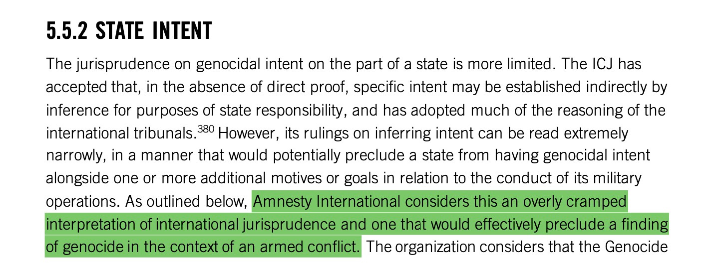 Bij het definiëren van een (c.q. hun) voorwaarden voor een genocide, schrijft Amnesty namelijk dat het van mening is dat jurisprudentie van het Internationaal Strafhof (ICJ) tot te nauwe interpretaties kan leiden. Om intentie van genocide vast te stellen vereist het internationaal recht dat het de enige plausibele verklaring is, gebaseerd op een patroon van gedragingen door de beklaagde en met ‘volledig sluitende’ vaststelling van deze intentie.