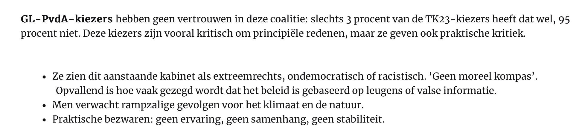 Het is een verantwoordelijkheid die de PVV domweg wel lijkt te willen nemen - en nee, daar zijn we niet allemaal als vanzelf beter mee af. De kans van slagen is klein en niet alleen omdat bekrompen links al voor de start van Schoof I alles uit de kast trekt om het politieke wantrouwen en de polarisatie te verhevigen. Zie onderstaand stukje uit een Ipsos-peiling van zaterdag, waaruit blijkt dat zelfs de democratie an sich in twijfel getrokken wordt onder linkse kiezers. Dat zijn Trumpiaanse toestanden, linkse vrinden!