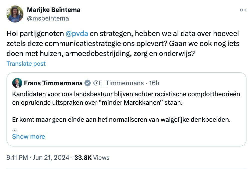 Een belangrijke aanjager van zulke opvattingen is Frans Timmermans, die sinds de verkiezingen geen enkel ander liedje zingt dan het beklagen van Wilders, de PVV en ‘extreemrechts’. Binnen de geforceerde fusie tussen PvdA en GroenHamas sluimert nogal wat onderdrukte ideologische onrust (zeker inzake Israël en antisemitisme) dus Frenske heeft er baat bij om een gezamenlijke vijand te blijven benoemen. Dat is de laslijn tussen de twee linkse partijen. Zo reageerde hij vrijdag op het kruisverhoor van Reinette Klever (alhier heel snedig gescreenshot met een verzuchting van een PvdA’er erboven, die het eentonige bashen een beetje beu lijkt te zijn) met het bekende riedeltje van harde woorden tussen dramatische witregels: