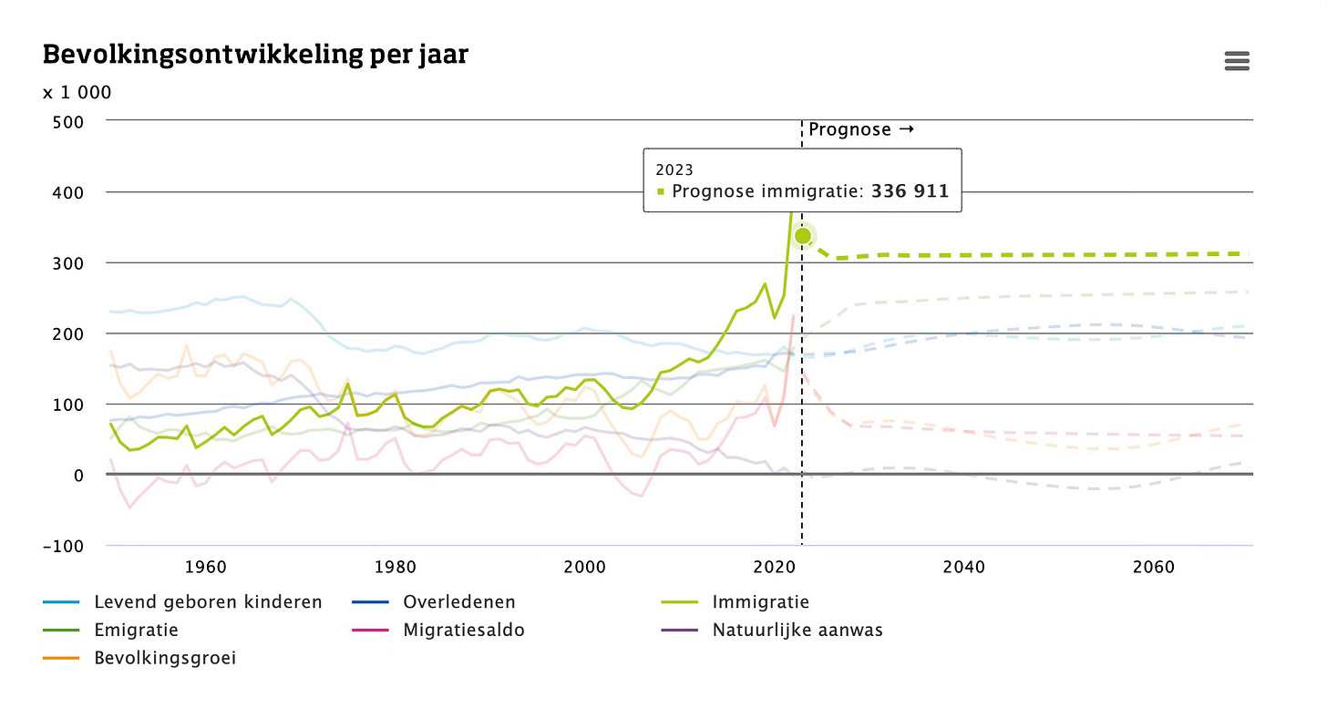 ‘De laatste jaren groeide de bevolking vooral door buitenlandse migratie. Ook in de toekomst is de verwachting dat het aantal immigranten groter zal zijn dan het aantal emigranten. […] Voor de komende jaren wordt verwacht dat de immigratie verder zal toenemen’ (CBS)