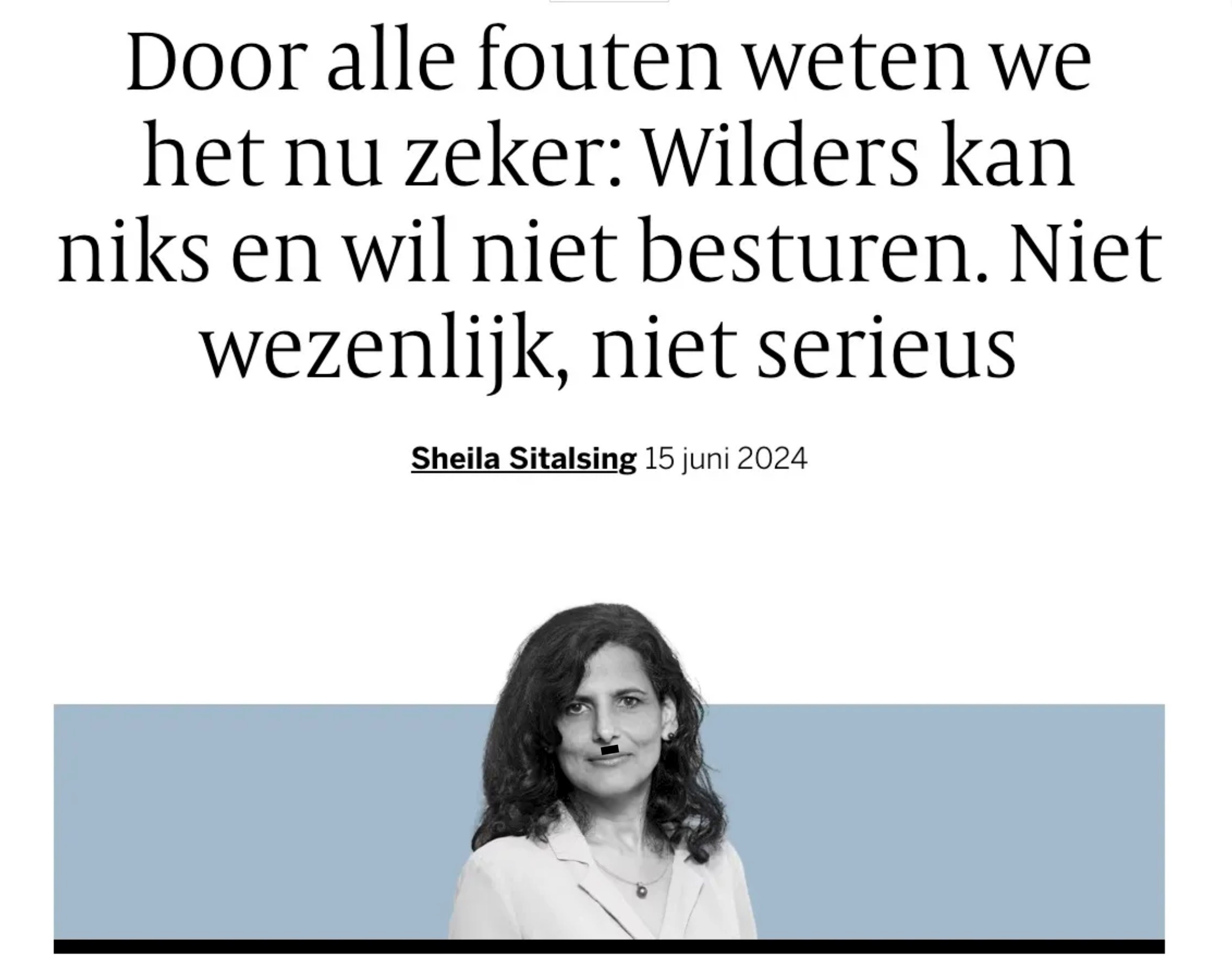 Het ademt een paniek, die heviger werd toen Gidi Markuszower succesvol getackeld werd (of liever: toen ze een geheimzinnig maar kennelijk niet te negeren AIVD-memo in de schoot geworpen kregen). Sheila Sitalsing nam nog maar eens een slok azijn en spuugde een column uit waarin ze fulmineerde hoe Wilders eigenlijk helemaal niet wil regeren, wat bewezen zou worden door zijn gebrekkige personeelsbestand. Alsof Wilders zelf niet als eerste in opperste verbazing, stupéfait bijna, zo met die twee handen voor zijn gezicht, reageerde op de verkiezingsuitslag van 22 november. “Vij-vun-dar-tig!” (Wat later nog opliep tot 37 - BN)
