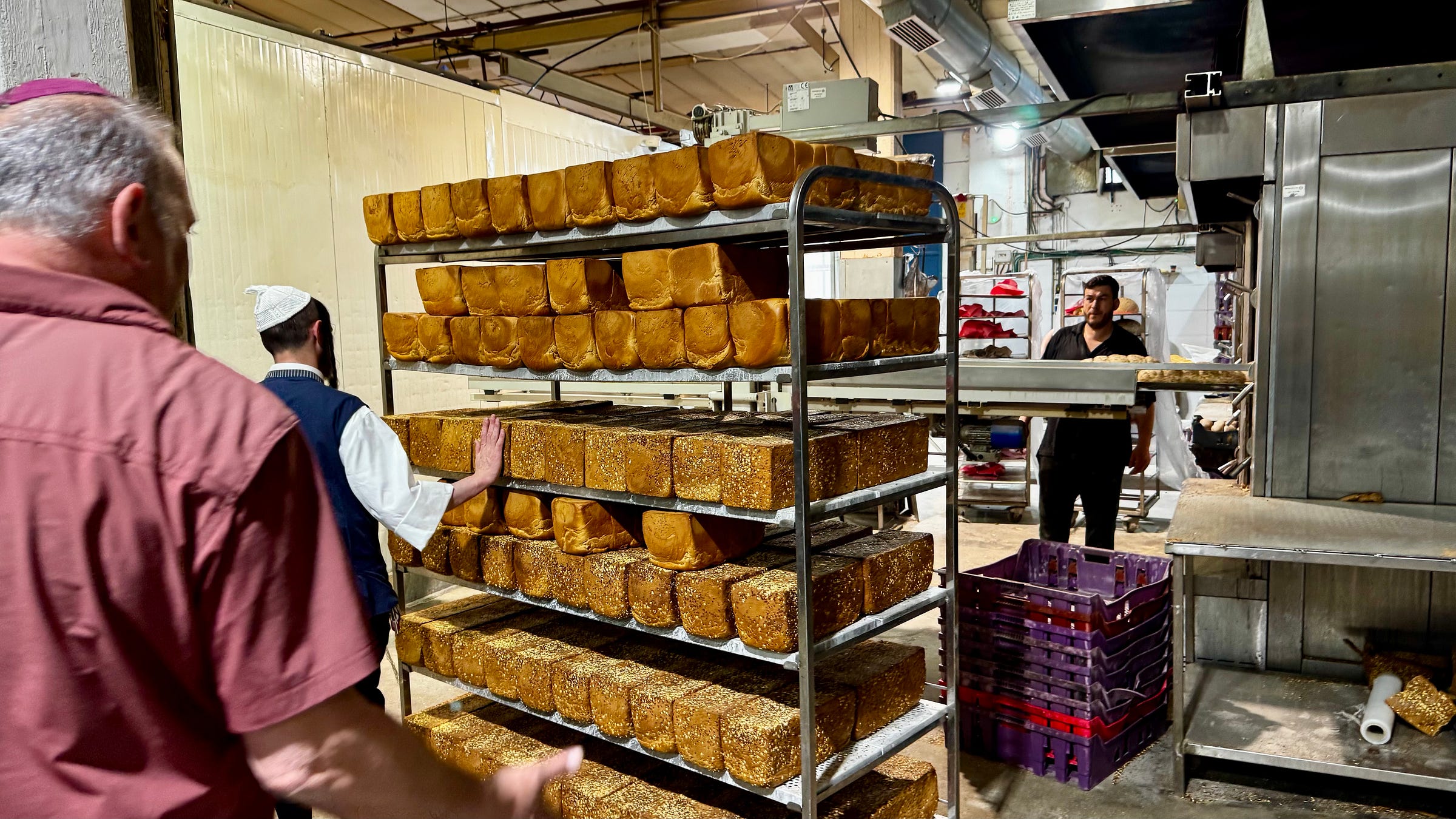 Als anekdote voor Barkan bezoeken we zelf een broodfabriek. Het bezoek is ongepland: we zouden een andere stop maken die op het laatste moment niet doorging. Kuti heeft in de bus tussen Nablus en Barkan snel een alternatief geregeld en dat werd de bakkerij van Reuven, een orthodoxe Jood van 33 die een maand eerder vader is geworden van zijn achtste kind. Hij spreekt geen woord Engels en ontving nooit eerder een buitenlandse journalist. Ook Kuti maakt voor het eerst kennis met hem (en dat is waarom de achternaam van de bakker ontbreekt).