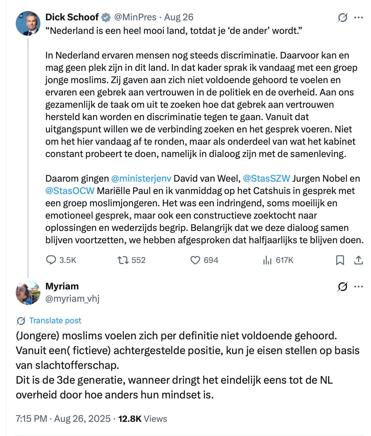 Er verscheen deze week wel een veel te lange tweet van zijn hand (c.q. van zijn social media-secondanten) over een gesprek met teleurgestelde moslims, die op het Catshuis hun beklag over vermeende achterstelling hadden mogen doen. Een bilateraaltje met onbeduidende clubjes dat noch de ambtswoning, noch het aantal woorden waard was en daarmee vooral liet zien hoe makkelijk knielende bewegingen in de verkeerde richting worden gemaakt - zelfs door ‘het meeste rechtse kabinet ooit’. De anti-joodse sentimenten onder islamitische medelanders werden in de tweet van Schoof niet benoemd. Aan tafel dus vermoedelijk ook niet.