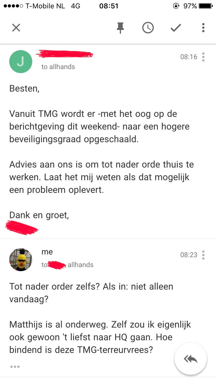 TMG investeerde na Hebdo al inveiligheidschecks en beveilingsmaatregelen voor Pand Noord (dat niet eens van hen was) maar direct na Bataclan wilde de directeur van een ander bedrijfje in ons verzamelpand GeenStijl het gebouw uit hebben. Via een interne mail zocht deze lafaard daarvoor medestanders - ik kreeg de mail doorgespeeld en gooide die terstond integraal online.