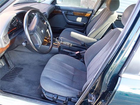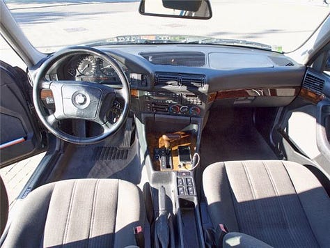 Eerder had ik al eens een lichtblauwe 520i gehad, een iets te kleine zescilinder met 129 pk uit 1988 met stomme wieldoppen en zwengelramen maar wel een schuifdak. Ik bouwde er een MiniDisc-speler in en reed in de zomer van 2002 met twee vrienden naar Duitsland, Oostenrijk, Tsjechië en Hongarije. Voor het eerst de 220 aangetikt op de Autobahn!