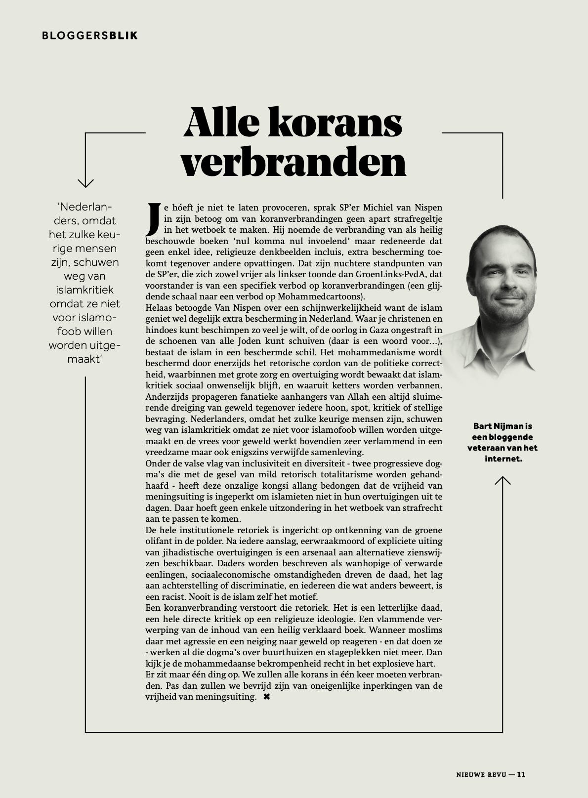 Over koranverbrandingen nog onderstaande column uit Nieuwe Revu van deze week, ingeleid door de woorden uit het debat van SP’er Michiel van Nispen, van de laatste en enige linkse partij die het nog lijkt te begrijpen.