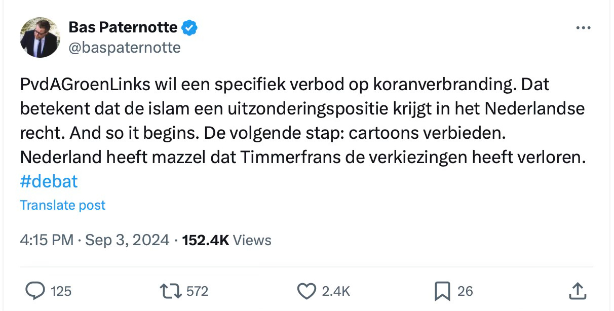 Stephan van Baarle van DENK gebruikt ondertussen stellig maar beleefd verwoorde moties om de grieven van zijn geloofsgenoten te vertolken. Er is een kat-en-muisspel gaande waarin de politieke islam, geholpen door linkse partijen, aftast of de tijd al rijp is voor een nieuwe stap naar voren voor hun eigen geloof in iedereens seculiere samenleving. Laat je niet in de luren leggen door de keurige retoriek van hun moties, of de opportunistische timing van Ahmed Marcouch om voor een verbod op koranverbrandingen te pleiten, zo kort na de infiltratie van islamitische normen op het voorheen neutrale gebied van de wetshandhaving.