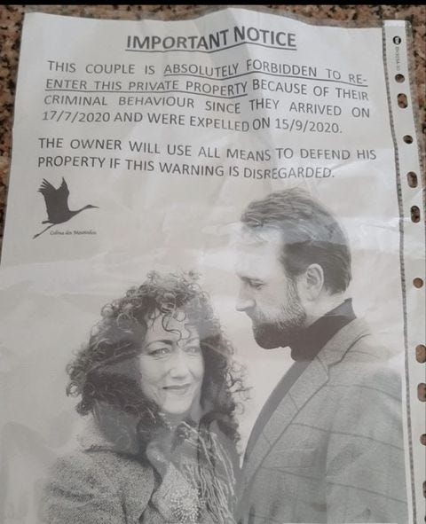 We were still desperately trying to find alternative accommodation when he tried to poison our dogs, and then he physically attacked me. The police were called again. They didn’t bother coming out. This is seriously condensed as a story. It was hell. We couldn’t leave the house empty so had to go out separately. We found a house to rent that was being renovated. There was no working kitchen as such, but once we'd explained our situation, the landlord Antonio said as long as we were happy to live in it while the renovation was finished, it was okay with him. We got our stuff and left. Two days later, Hugo put posters all over the town with a photo of us that he'd lifted off FB saying we were criminals and he would use force if we attempted to return and we shouldn't be trusted. The Police did nothing. Again. See the photo attached.