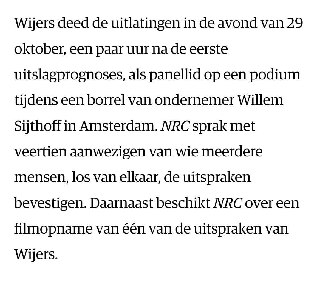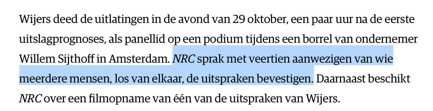 Mijn theorie is dat NRC hetzelfde filmpje heeft als dat Kockelmann liet zien. De krant heeft namelijk nooit expliciet beweerd dat ze beelden hebben waarin Wijers “leugenaar” zegt. Let maar eens op het subtiele gebruik van het woord “daarnaast” in de slotzin van onderstaand fragmentje uit het eerste NRC-verhaal van 13 november.