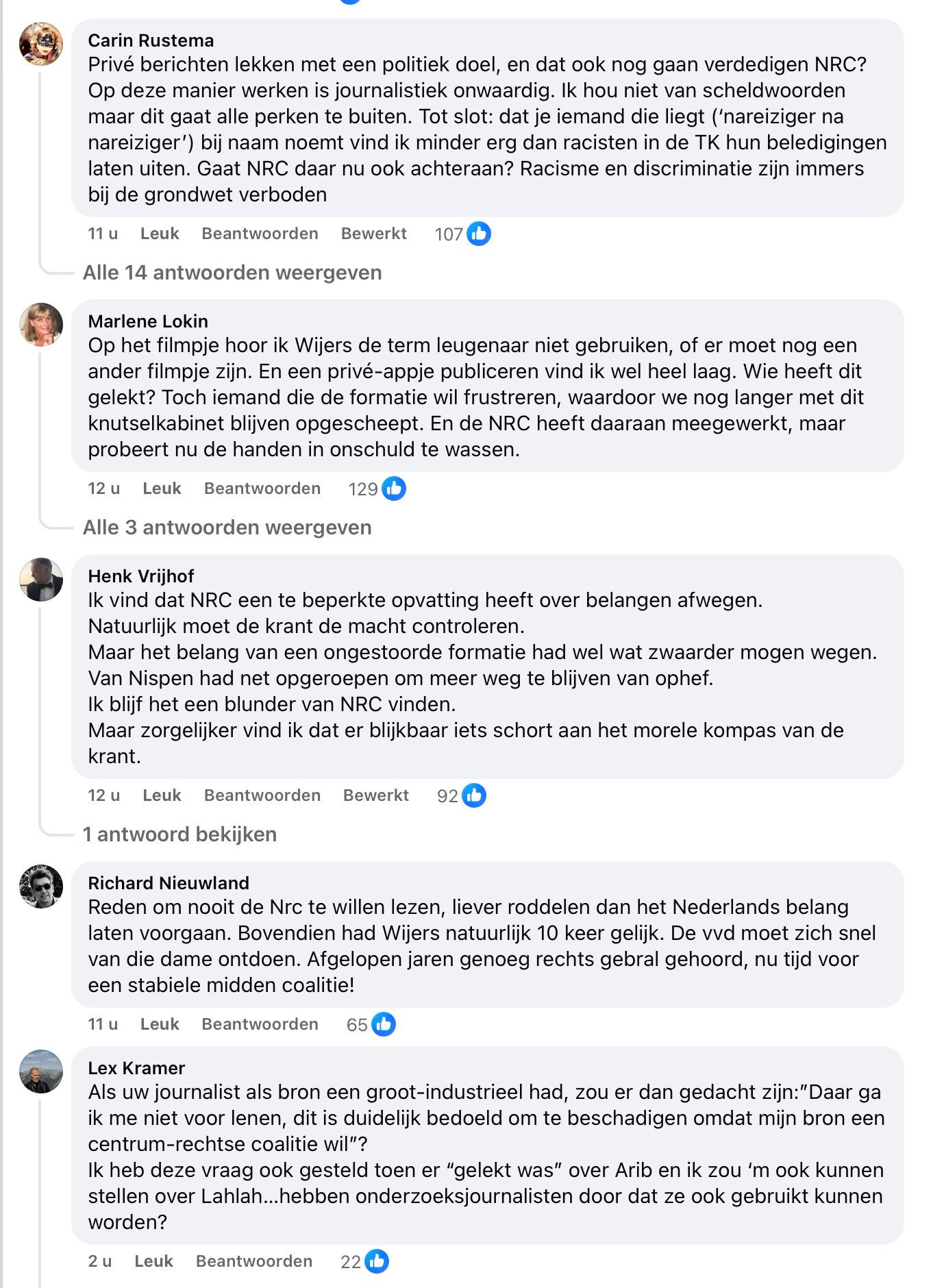 De kritiek op de Nurk zwol zo hard aan dat Patricia Veldmuis Veldhuis, de hoofdredactrice van NRC, op zaterdagavond 15 november als excuustruus in de pen klom met een uitvlucht verdediging paniekreactie verklaring onder de kop “Waarom NRC besloot het nieuws over informateur Wijers te publiceren” (mirror). Eerste zin in de lead: “Door publicatie van een appje van Hans Wijers richtte NRC deze week de aandacht op zich.” Prachtige combi van boetekleed en zelfbetrekking.