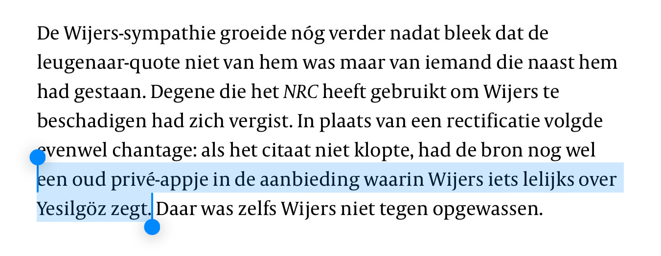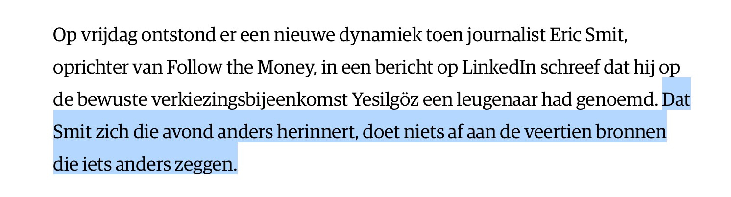 “‘Dat Smit zich die avond anders herinnert, doet niets af aan de veertien bronnen die iets anders zeggen’, schrijft Patricia Veldhuis. Maar wat zeggen die bronnen nu precies? Daarover is het artikel niet duidelijk en ook Veldhuis niet. Hebben ze allemaal gezegd dat Wijers Yesilgöz voor ‘leugenaar’ heeft uitgemaakt? Nee, anders schrijf je dat op. Inmiddels staat het ook vast dat NRC geen ondersteunend filmpje kan produceren. Veldhuis schrijft er niets over.