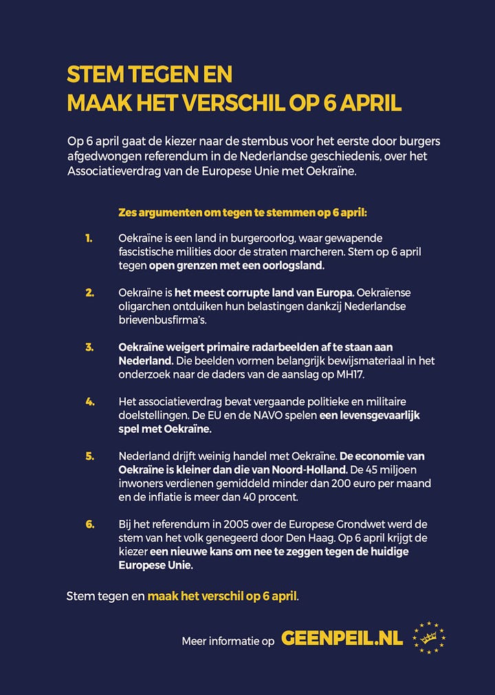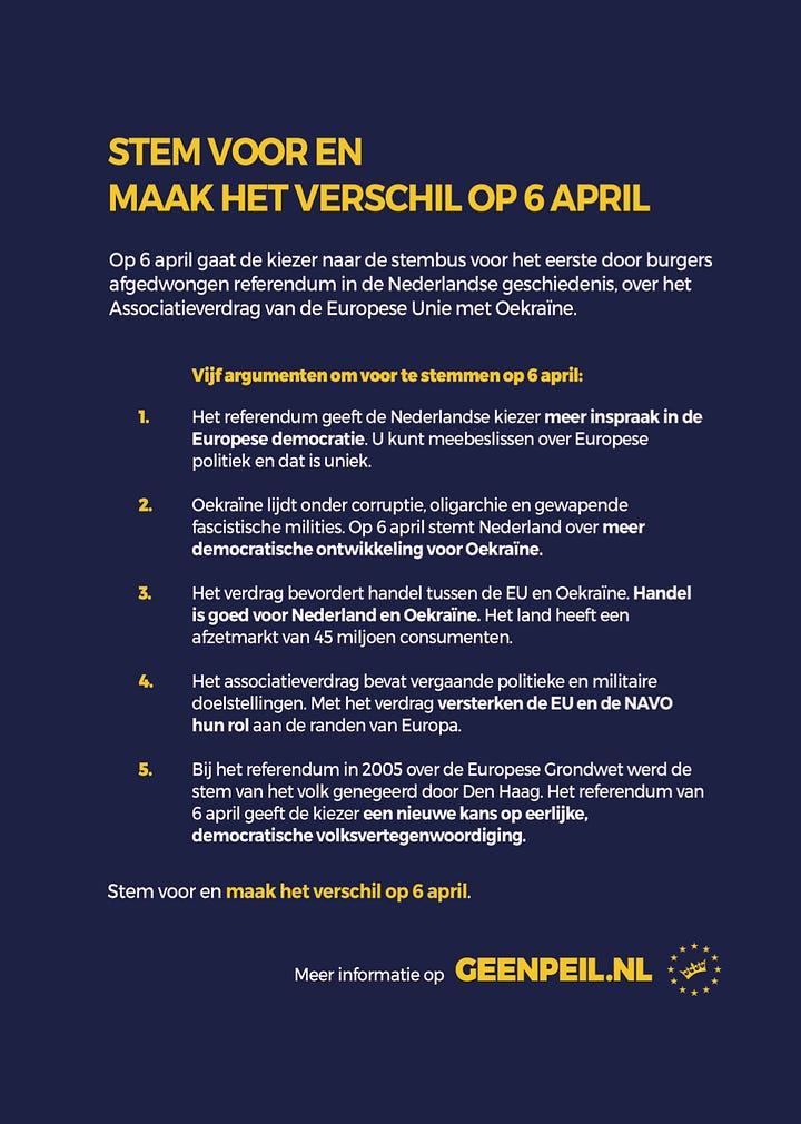 Op 21 januari werd ik door Laurens Groeneveld van VPRO Argos benaderd voor een interview. Insteek: “een reconstructie van de campagne rondom het Oekraïne referendum, nu bijna tien jaar geleden. Hiervoor spreken we met verschillende hoofdpersonen uit die periode.” Daaronder enkele voorzetjes voor vragen waar ik - door schade en schande wijs geworden - al direct wat vooringenomenheid in las. Desalniettemin stemde ik toe, omdat ik wilde voorkomen dat (wederom & zoals te doen gebruikelijk) enkel de geijkte tegenstanders, vuilspuiers en fantasten aan het woord zouden komen.