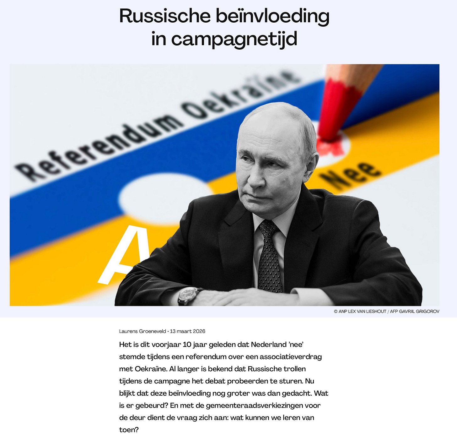Maar ja. Of het nou een pro-Rus was tijdens een debat over het associatieverdrag in Delft aan de vooravond van het referendum (waar Argos een overdreven punt van maakt), of een paar commenters, twitteraars of andere online opiniespuiers met een pro-Russisch propagandadoel: al tien jaar lang focussen media op microscopische anekdotes in hun pogingen het complete referendum als een Russisch Spiel te framen, met de initiatiefnemers als gewillige pionnen van Poetin.
