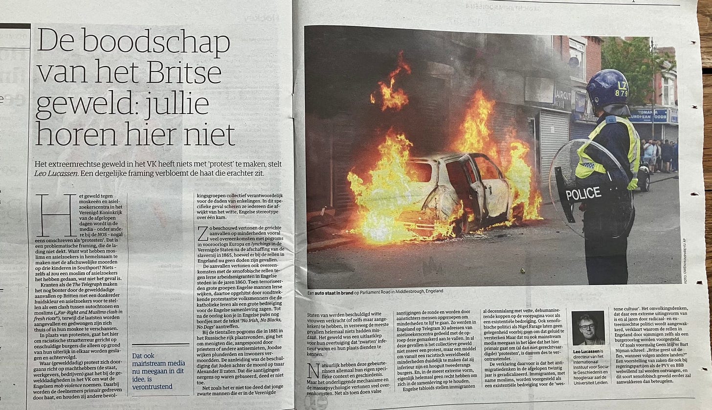 Het is verontrustend, schrijft Leo Lucassen, dat mainstream media verslag doen van de onrusten in Engeland als ware het ‘protesten’. Volgens hem betreft het namelijk ‘xenofobisch geweld’ en ‘racistische straattereur’, dat door extreemrechtse politici wordt aangewakkerd.