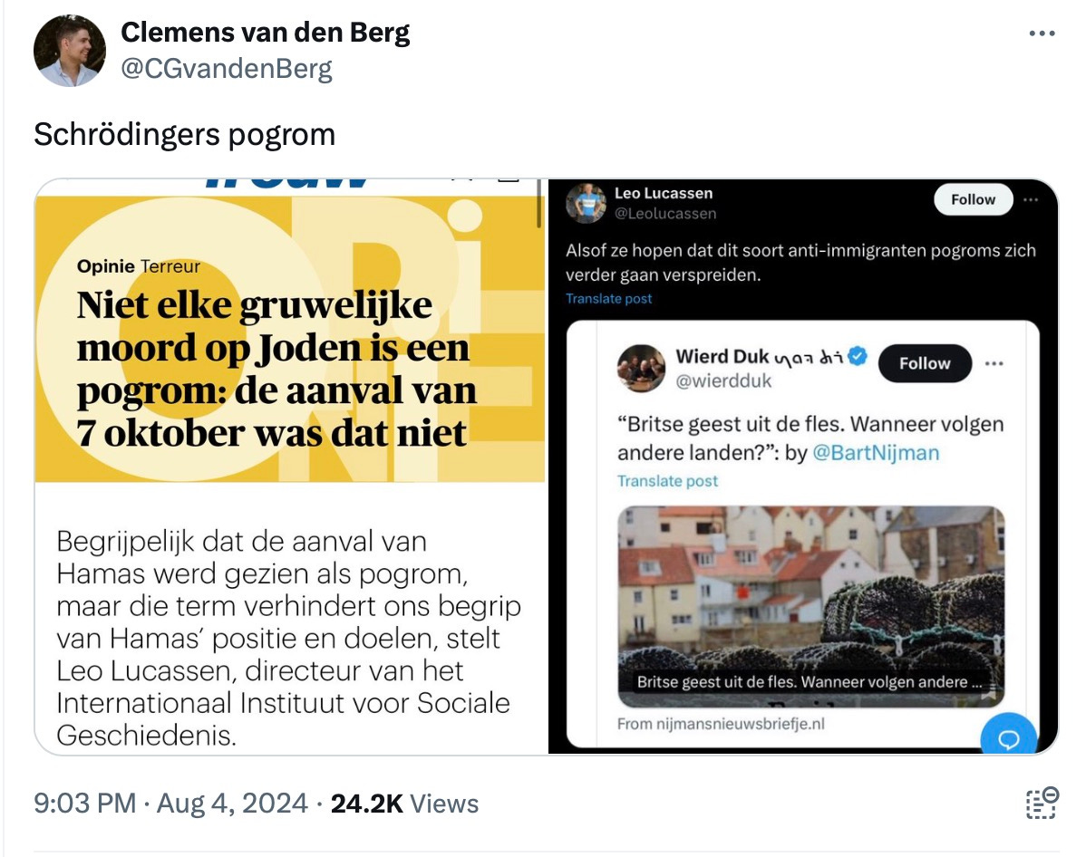 In het slot van zijn betoog slaat hij het bruggetje naar Nederland, door aan de hand van slechts de kop boven een artikel van mijn hand (‘Britse geest uit de fles, wanneer volgen andere landen?’) te beweren dat deze ‘voorstelling van zaken bij regeringspartijen als de PVV en BBB welwillend zal worden ontvangen, en dit soort xenofobisch geweld eerder zal aanwakkeren dan beteugelen.’