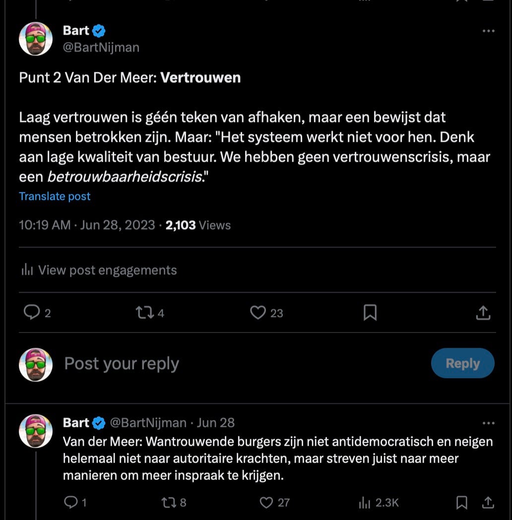 Allemaal bijwerkingen waar ik in ieder geval niet tegen ben, in een tijd waarin de reuzen van weleer lemen voeten hebben, of al zijn weggesmolten: PvdA, CDA, wie weet volgt de vvd ook nog nu Rutte vertrekt en vervangen wordt door wat toch voelt als een wat wankele Dilan Yesilgoz. Nederland is daarnaast te klein om alle institutionele checks & balances door een gesloten (en elitair, arrogant en/of activistisch) borrelnetwerk van ons-kent-ons achterkamerkennissen te laten beheren, maar ook fysiek klein, digitaal verbonden en maatschappelijk geopinieerd genoeg om iedere stem te kunnen laten meewegen op specifieke onderwerpen.