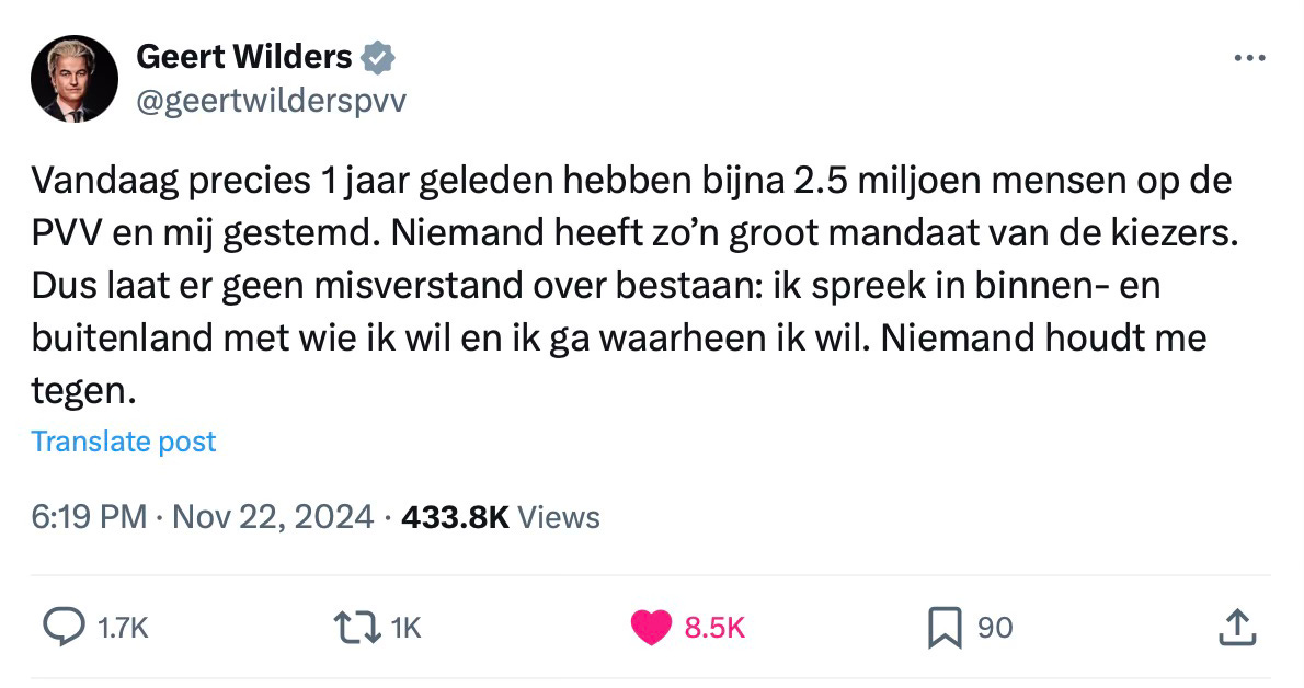 Op de eerste verjaardag van zijn verkiezingszege twitterde de PVV-leider dat ‘bijna 2.5 miljoen mensen op de PVV en mij gestemd hebben. Niemand heeft zo’n groot mandaat van de kiezers. Dus laat er geen misverstand over bestaan: ik spreek in binnen- en buitenland met wie ik wil en ik ga waarheen ik wil. Niemand houdt me tegen.’