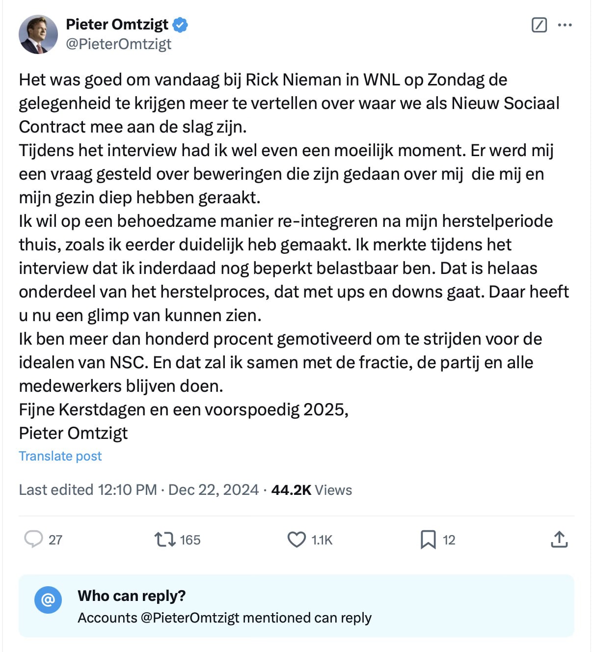 Niet dat een partijleider in dit tijdsgewricht in een uiterst gespannen, gepolariseerd land en in het oog van de storm die Schoof-I is überhaupt aan rust kan toekomen, want al in zijn eerste debat na terugkeer moest Omtzigt in een stemverklaring aangeven waarom NSC hun minister van Buitenlandse Zaken Caspar Veldkamp steunt, die binnen een paar uur na het publiceren van aanhoudingsbevelen van het Internationaal Strafhof (ICC) tegen Israëlische premier Benjamin Netanyahu en defensieminister Yoav Galant vanwege vermeende oorlogsmisdaden in Gaza al plompverloren verklaarde deze heerschappen aan te zullen houden zodra zij voet op Nederlandse bodem zetten.