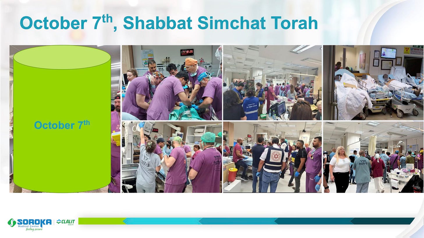 “Soroka Medical Center (SMC) is is het enige medische centrum in Zuid-Israël, voor ongeveer 1 miljoen mensen. Ik herinner eraan dat Israël heel klein is: SMC ligt op ongeveer 45 minuten van de grens met Gaza, of 12 tot 15 minuten met een helikopter. Ziekenhuispersoneel komt ook uit de grenszone. Onofficiële berichten kwamen binnen via WhatsApp-groepen van personeel, over gevechten die gaande waren in de kibboetsen.