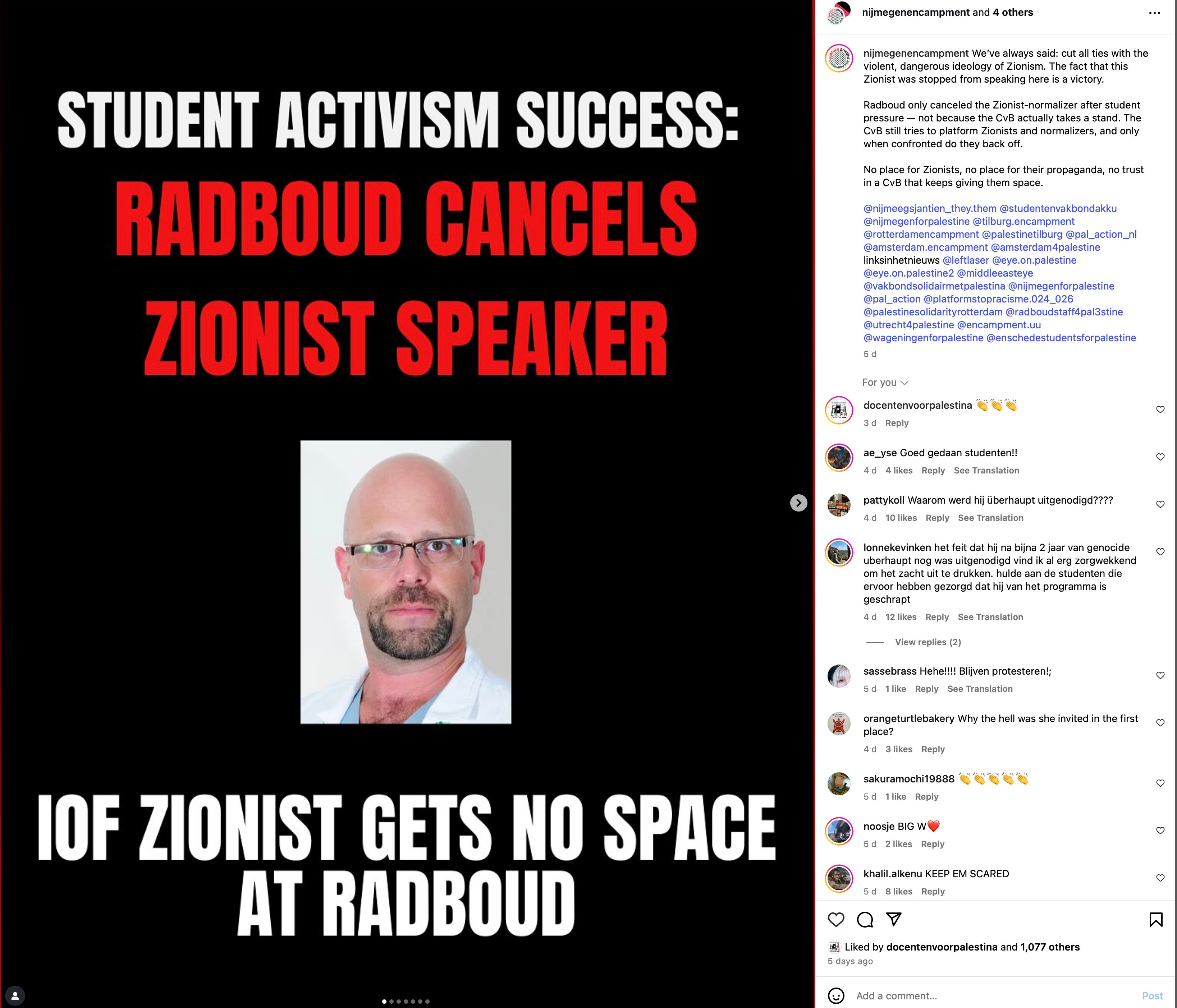 Toen de organisatie vervolgens een alternatieve locatie zocht, kwamen er intimidaties en bedreigingen vanuit pro-Palestijnse studentengroepen. Daarop werd ook die bijeenkomst geannuleerd. “Daarna hebben we elders alsnog een kleine meeting gehouden”, vertelt dr. Vered Raz. “Want anders winnen zij.” Op Instagram vierden de extremistische studenten alsnog hun overwinning. De soft-spoken trauma-arts wordt met naam en toenaam als “nazi” neergezet in een post.