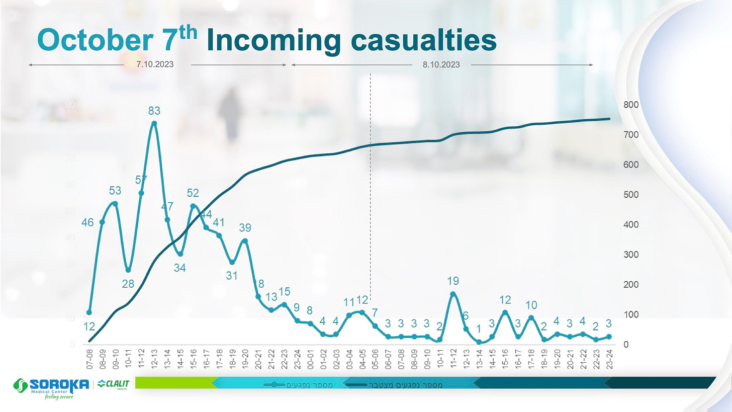 In het Soroka-ziekenhuis werken in totaal ongeveer 5500 mensen en er zijn bedden voor 1200 patiënten. Tijdens de eerste dagen na 7 oktober waren vele duizenden mensen aan het werk in het ziekenhuis, ook om de honderden ‘reguliere’, reeds aanwezige patiënten te verzorgen. Sinds het begin van de oorlog zijn bijna 4500 patiënten behandeld, onder wie ruim 3300 militairen en ook zeven gijzelaars die uit Gaza zijn teruggekeerd. Al ruim driehonderd keer, dus ongeveer om de dag, landde een legerhelikopter met geëvacueerde, gewonde IDF-militairen uit Gaza op de heli-pad van het hospitaal.