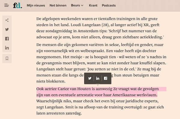 Een dag later werd zijn klimaatbeweging Extinction Rebellion op Radio 1 geprezen om hun geweldloosheid, want: “De klimaatgevolgen zijn zo groot dat het in zekere zin begrijpelijk zou zijn als ze verdere stappen zouden nemen.” Precies dat soort woorden plaveien dus de weg naar geweld. Het omslagpunt komt langzaam maar onvermijdelijk dichterbij en het begint met kleine dingen.