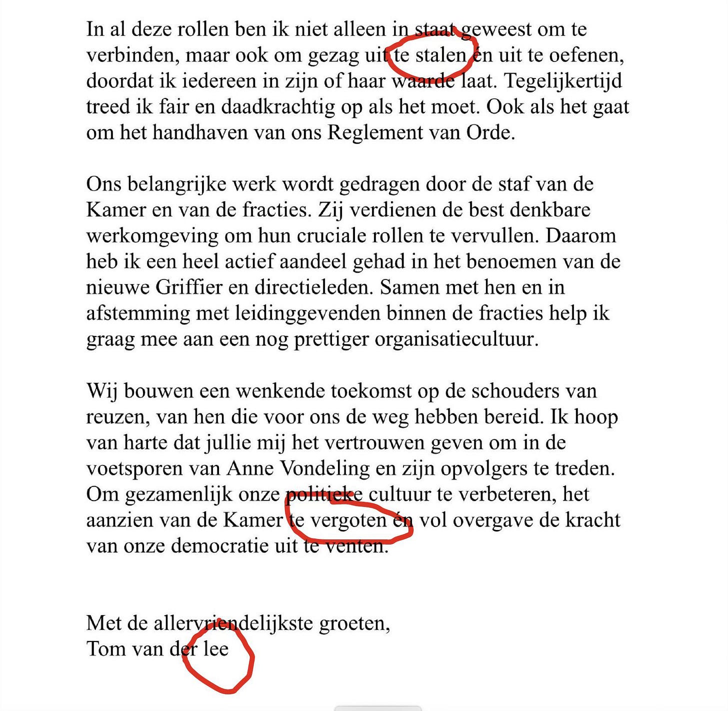 Overigens kan derde kandidaat Van der Lee behalve geen correct Nederlands schrijven, zelfs zijn eigen naam niet correct spellen, getuige zijn eigen brief. Heb je écht zin in de baan als er zulke fouten in je sollicitatie blijven staan?