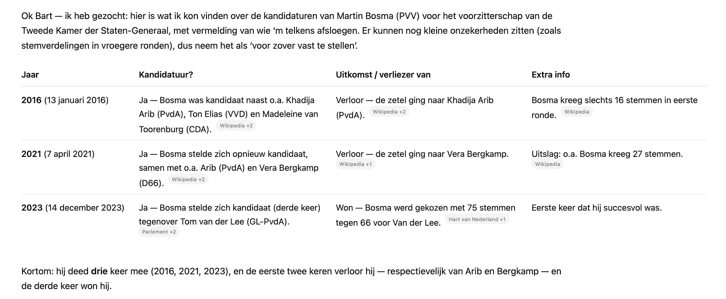 In de laatste Nijman & Charante Podcast van maandag (gisteren) somberden we met de blik vooruit op vandaag (dinsdag) dat Bosma het zal afleggen tegen politieke koehandel van de VVD: niet met GroenLinks in een coalitie maar wel als handreiking de hamerkansen voor Van der Lee vergroten. De sollicitatiebrief van Thom van Campen las namelijk als een schoolkrantstukje van een iets te jonge schijnkandidaat, en daarmee als een politiek opzetje van de boven hem gestelden.