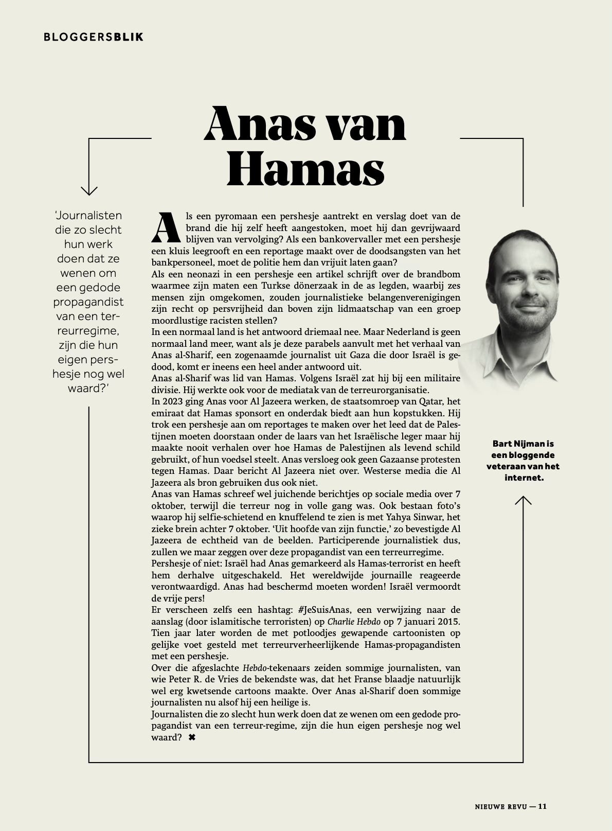 Dat narratief laaide op toen enkele weken terug Anas al-Sharif, aantoonbaar Hamas-lid en 7 oktober-verheerlijker vermomd achter een persvestje, uit Israëls lijden werd verlost. Voorzitter Thomas Bruning van de NVJ sprak zich toen - tegen alle bewijzen voor de dubbelrol van Anas in - ferm uit tegen Israël (wat tot minstens één opzegging leidde).