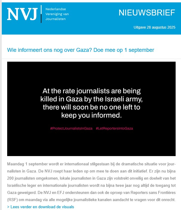 De Nederlandse Vereniging voor Journalisten heeft een activistisch pamflet verspreid onder alle leden van de vakbond. Daarin wordt opgeroepen tot een “global media blackout” voor Gaza op maandag 1 september. De afzenders zijn activisten-machine Avaaz en Reporters Sans Frontieres (RSF), en de NVJ ondersteunt hun actie en roept haar leden op mee te doen aan dit internationale initiatief.