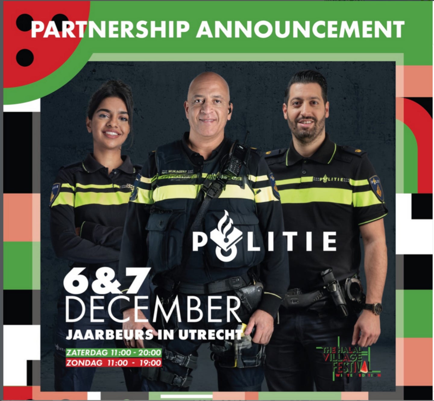 Foto’s van agenten in een moskee, video’s van agenten die bidden in een moskee, politie-iftars in het hele land, politie-kraampjes tijdens een halal huishoudbeurs in Utrecht, aangekondigd als een “partnership” op socials van de organisatie en in de watermeloen-kleurstelling van de pro-Palestijnse propaganda (c.q. van de onderliggende Jodenhaat): het is islamisering maar het wordt genormaliseerd als een uiting van gemeenschapszin en deze vorm van witwassen is kennelijk niet strafbaar.