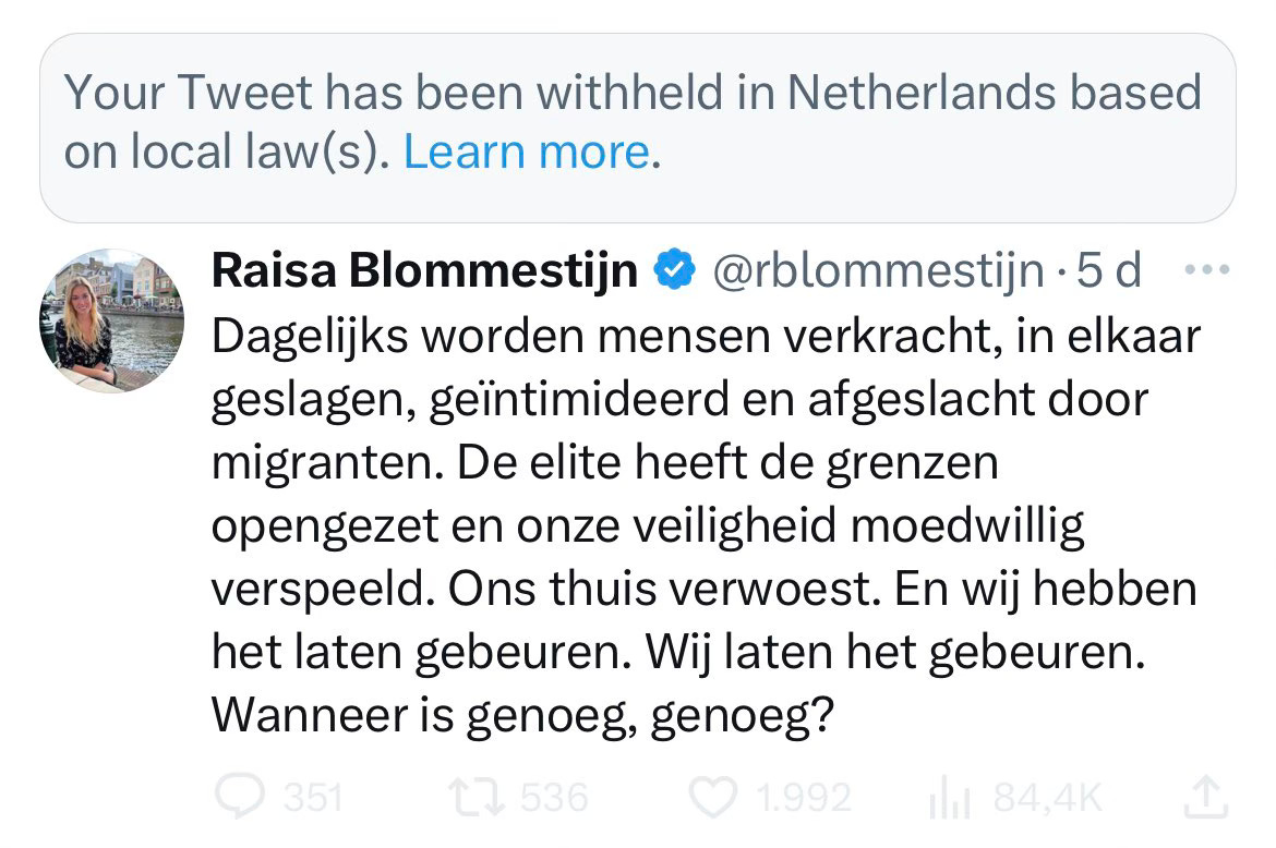 Die context geschetst hebbende. Blommestijn deelt de ene complottweet na het volgende stukje desinformatie, maar voor een gechargeerd geschreven tweet over migratie die wel degelijk een zeker waarheidsgehalte kent, moet ze zich bij het OM verantwoorden? Wat een stupide verhaspeling van prioriteiten weer bij het gezag. Raisa schreef al eerder in een column - eveneens in augustus 2023 trouwens - dat de overheid zich sterk voor haar doen en laten zou interesseren.