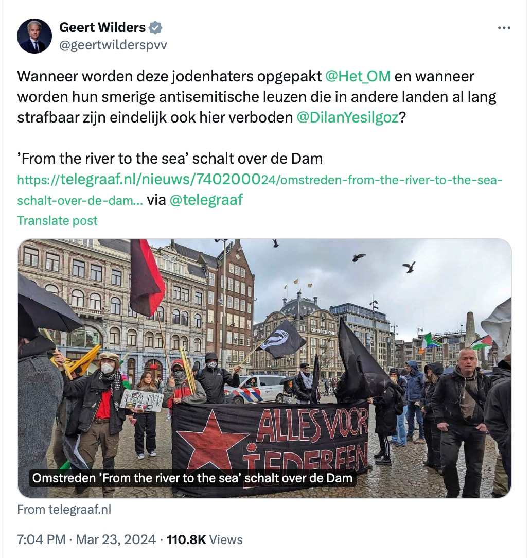 Er klinkt bijvoorbeeld ook een roep om een verbod van de leus “From the river to the sea”, omdat het een roep om de vernietiging van Israël en dus de facto een genocide op het joodse volk betekent. Geert Wilders verlangde gisteren nog zo’n verbod maar ook dat is een zeer onwenselijk voorstel. Met die leus bekennen mensen kleur en het is niet goed om zo’n uiting strafbaar te maken - je moet kunnen horen wie zo dom, kwaadaardig of nuttig idioot is om ‘m uit te spreken.