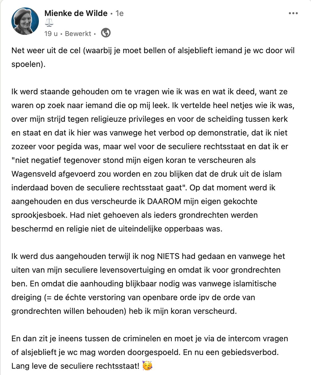 UPDATE/Aavulling: Rechtenstudent Mienke de Wilde brengt in Arnhem een nacht in de cel door en mocht naar huis met een gebiedsverbod na het verscheuren van een koran bij de demonstratie dit weekend, waar Edwin Wagensveld uiteindelijk niet kwam opdagen: