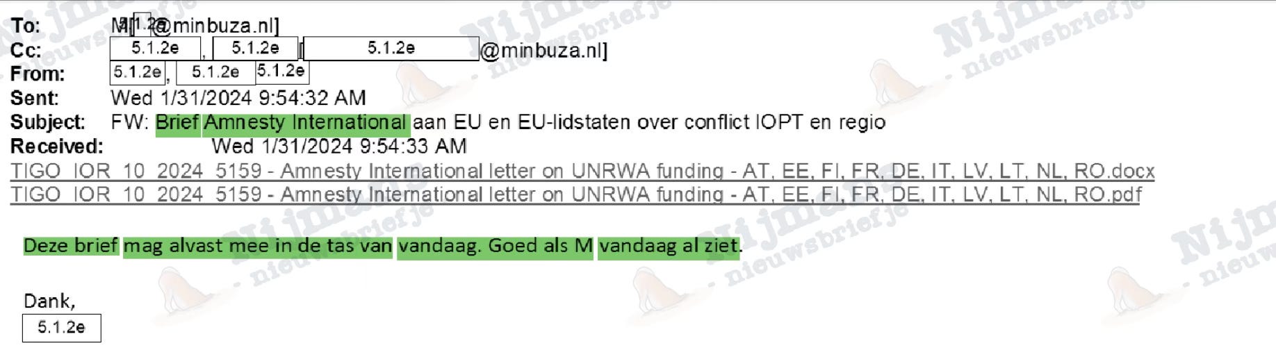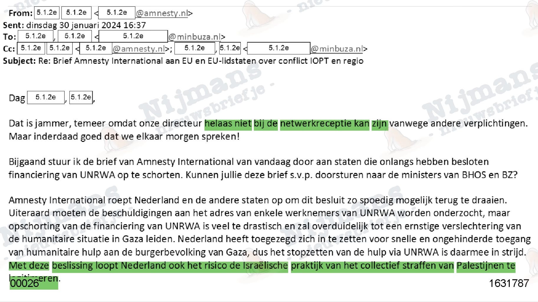 In een van de begeleidende emails bij een brief van Amnesty spreekt de organisatie van een ‘lastercampagne door Israël’ tegen UNRWA en wordt gesuggereerd dat Nederland ‘de Israëlische praktijk van het collectief straffen van de Palestijnen legitimeert’. Gaat ook allemaal in de tas van minister - al laat de medewerker van Amnesty weten helaas niet bij de borrel aanwezig te kunnen zijn.