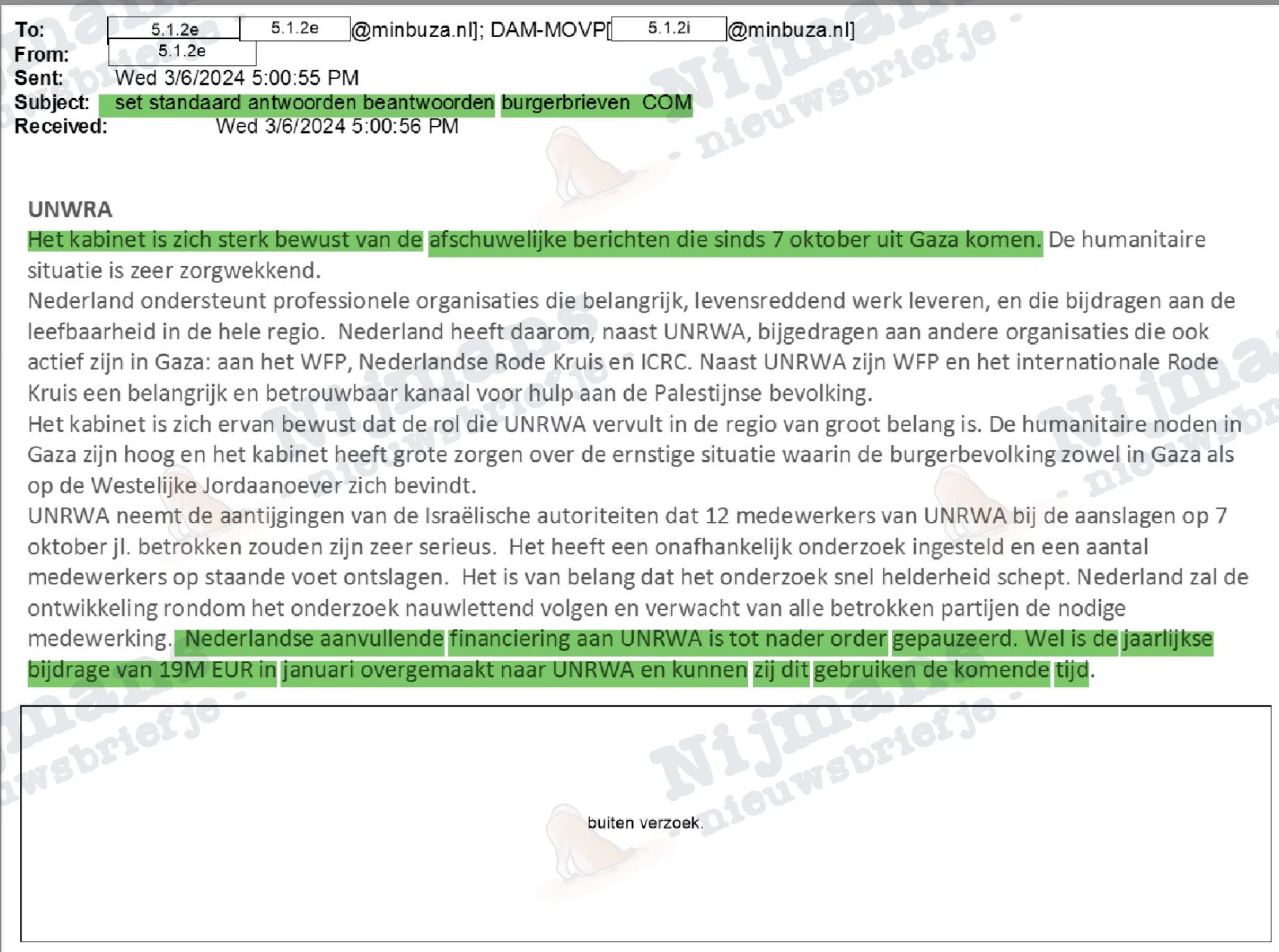 Uit mails van ambtenaren is te herleiden dat er ook brieven van burgers binnenkomen, zelfs op de ambassade in Washington, maar de inhoud daarvan wordt niet openbaar gemaakt. Wel zit er een (gedeeltelijk leesbaar) standaard-antwoord vanuit het ministerie tussen de stukken. Daarin wordt opvallend genoeg verklaard dat ‘het kabinet zich sterk bewust is van de afschuwelijke berichten die sinds 7 oktober uit Gaza komen’ (zeg maar de datum dat er vooral heel afschuwelijke berichten uit Israël kwamen). Deze standaardbrief voor burgers sluit af met de berustende woorden dat de subsidie slechts is ‘gepauzeerd’, en dat eerder al wel de normale betaling van 19 miljoen euro is overgemaakt.