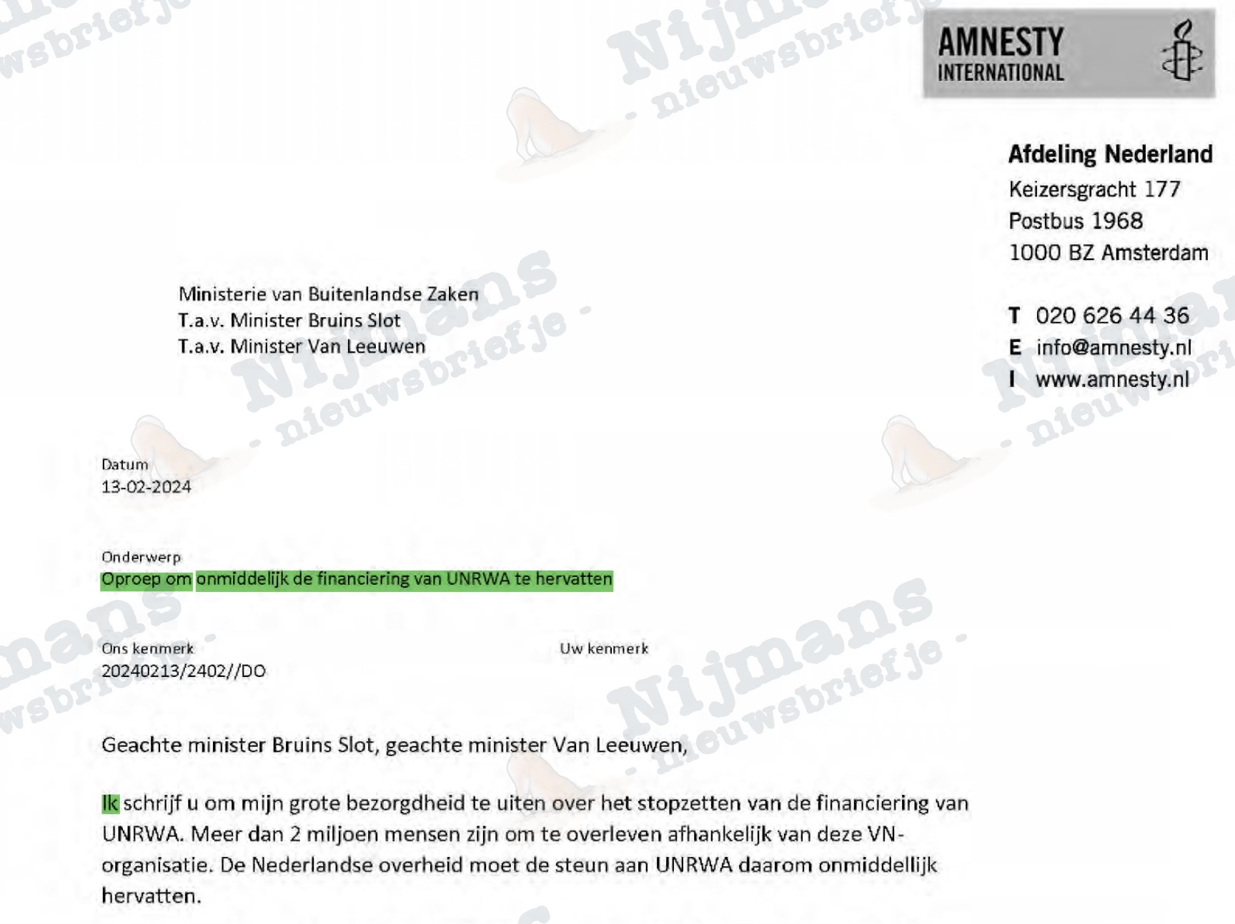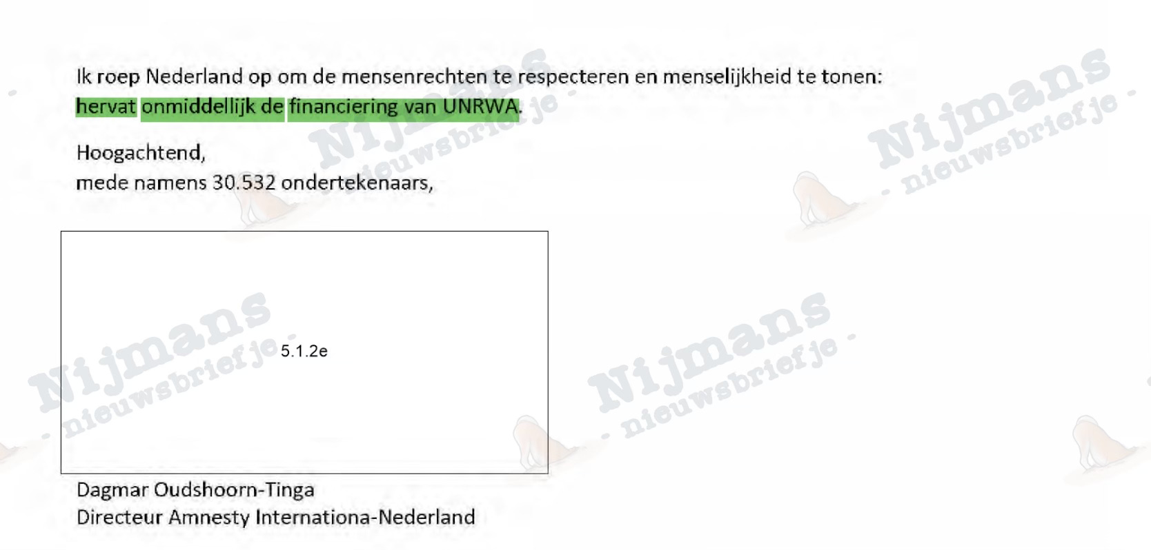 De eerste heuse petitie volgt ook al binnen twee weken: directrice Dagmar Oudshoorn-Tinga van Amnesty International (die van de zelfverzonnen genocide-definities) dient op 13 februari een brief op poten in bij BuZa-ministers Bruins Slot en Van Leeuwen. Daarin opent ze niet alleen met ‘ik’, ze sluit af met een opdracht in sterk gebiedende wijs, en stuurt een petitie mee die door ruim dertigduizend mensen is ondertekend: ‘hervat onmiddellijk de financiering van UNRWA’.
