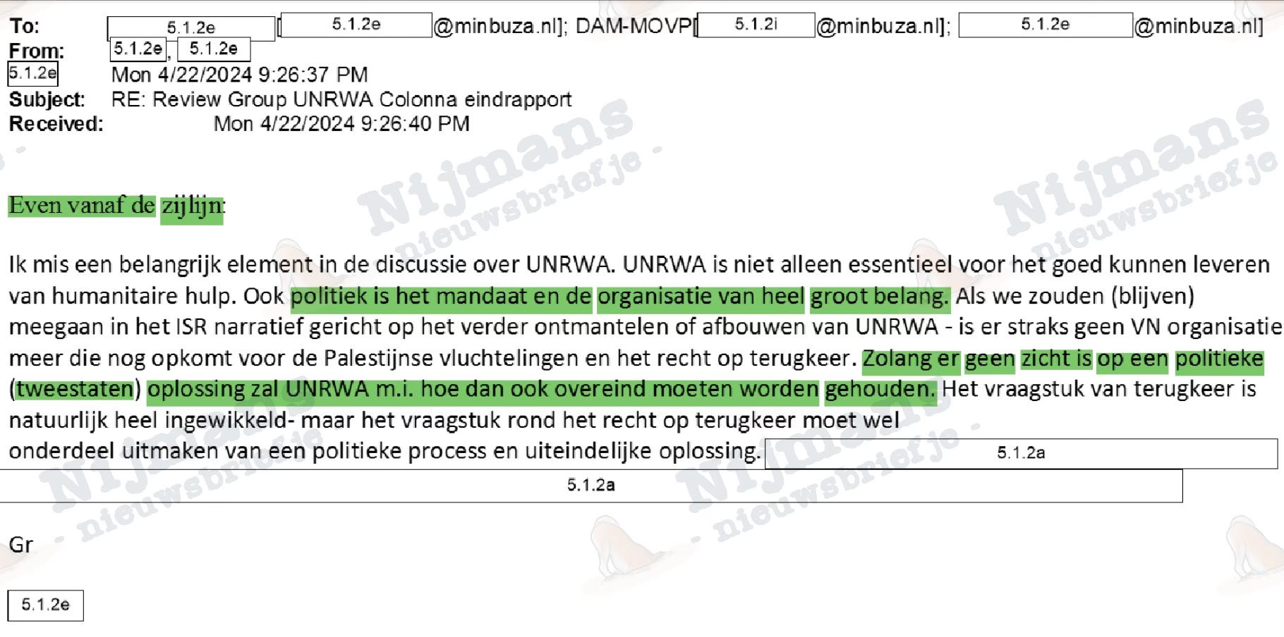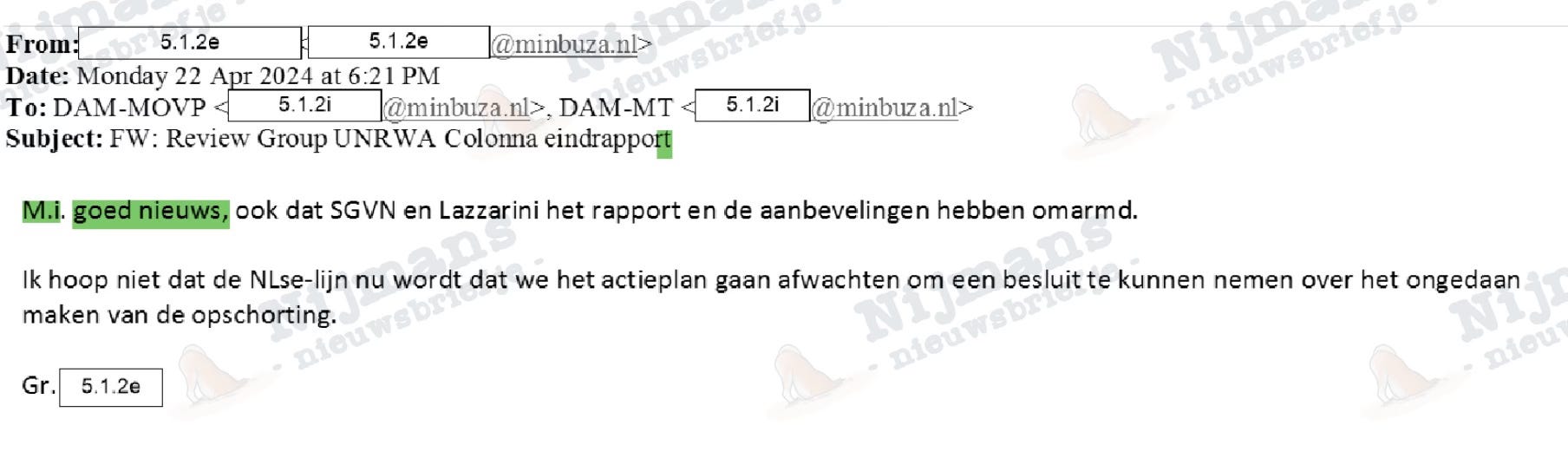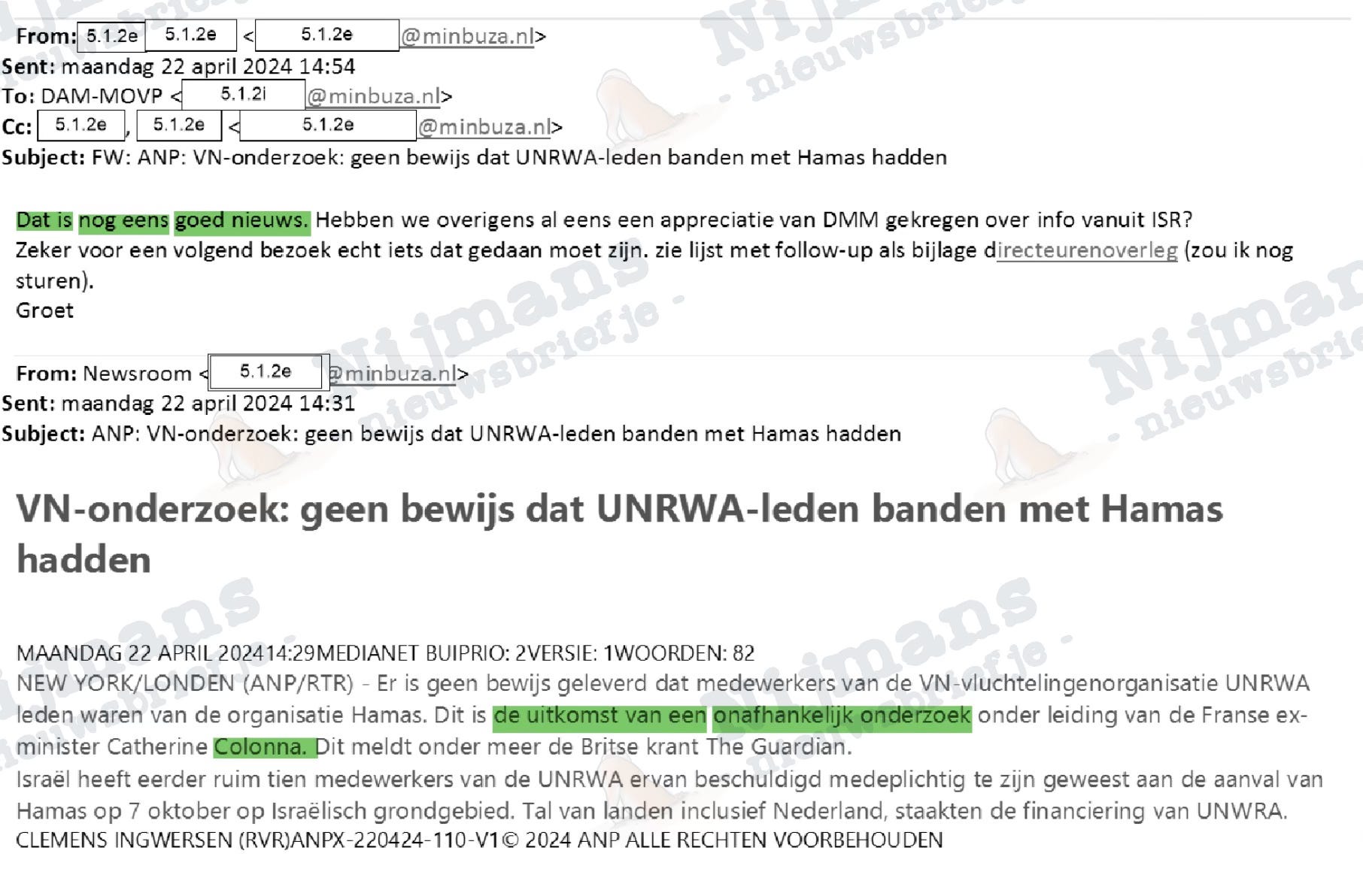 Daarentegen wordt desinformatie bij BuZa juist onthaald als ‘goed nieuws’. Nadat het Colonna-rapport naar de neutraliteit van UNRWA eind april is afgerond en de voormalige Franse minister van Buitenlandse Zaken Catherine Colonna met haar aanbevelingen komt, wordt een ANP-berichtje, waarin staat dat Colonna ‘geen bewijs’ gevonden heeft voor banden tussen UNRWA en Hamas, met enthousiasme ontvangen bij BuZa: ‘Dat is nog eens goed nieuws!’