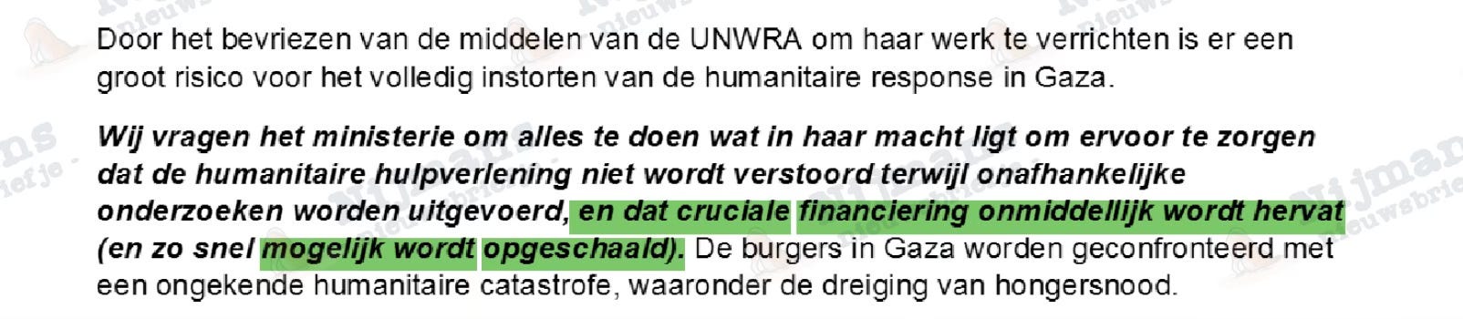 Al op maandagmorgen 29 januari, drie dagen na het besluit om UNRWA-subsidies op te schorten, ligt de eerste brandbrief op de ministeriële mat. De brief komt van Save the Children, dat zich beklaagt over de onduidelijkheid over ‘onder welke omstandigheden de Minister bereid zou zijn de financiering te hervatten’.
