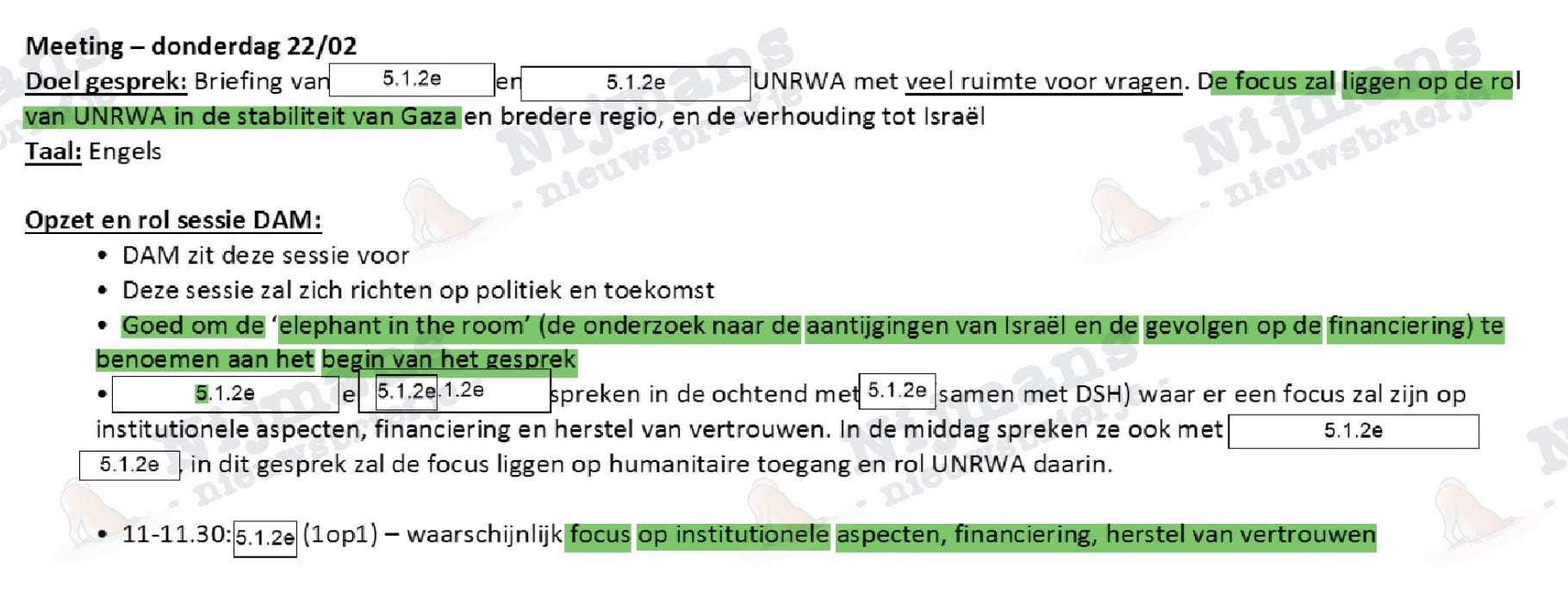 Op 22 februari komt UNRWA Chief of Staff Ben Majekodunmi zelf naar het ministerie aan de Haagse Rijnstraat. Het gehele programma van zijn bezoek is onleesbaar gemaakt en een verslag van die bijeenkomst ontbreekt in de vrijgegeven stukken. Wel is uit de agenda op te maken dat ‘de focus’ van het overleg niet de ‘olifant in de kamer’ zal zijn (alleen even ‘benoemen aan het begin’) maar op ‘de rol van UNRWA in de stabiliteit van Gaza’.