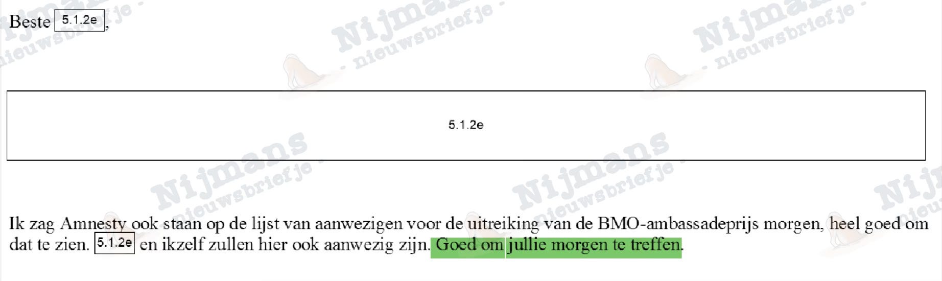 Tussen de documenten zitten meerdere brieven van Amnesty, die gaan ‘in de tas van de minister’ terwijl ambtenaren zich verheugen om medewerkers van de organisatie op borrels bij prijsuitreikingen tegen te gaan komen (‘Goed om jullie te treffen’).