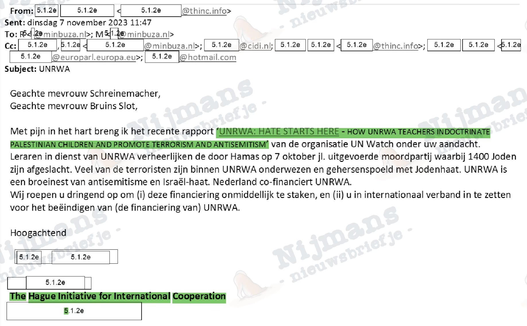 Het enige tegengeluid over UNRWA zat reeds begin november 2023 in de digitale postbus van BuZa, toen stichting THINC, een organisatie die Israël verdedigt in de context van internationaal recht, het ministerie wees op het rapport “Hate Starts Here” van UN Watch, en daarover (samen met het CIDI en een vertegenwoordiger van UN Watch) maar liefst drie kwartier mocht langskomen op 4 december van dat jaar. Hun oproep, onmiddellijke staking van financiering en een internationale inzet daarvoor door Nederland, blijkt naïef gedacht over de mentaliteit bij BuZa: twee weken na de bijeenkomst ging er juist tien miljoen euro aan extra Nederlandse subsidiegelden naar UNRWA, bovenop de regulieren jaarlijkse betalingen van 19 miljoen euro.
