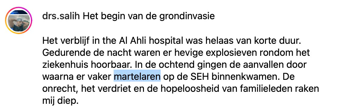 Vooropgesteld: het is moedig om jezelf via-via naar een oorlogsgebied te verplaatsen, met alle risico’s van dien, en te doen wat je kunt. Salih heeft hulp verleend op plekken waar weinig mensen en weinig middelen zijn, en waar weinig rust je gegund is. Zijn Instagram is gevuld met beeldmateriaal waarop hij te zien is tijdens orthopedische operaties in voornamelijk het Al Shifa-ziekenhuis, in een gebied dat belegerd en beschoten wordt, en grotendeels in vernieling ligt. Wat dat betreft niets dan kudo’s.