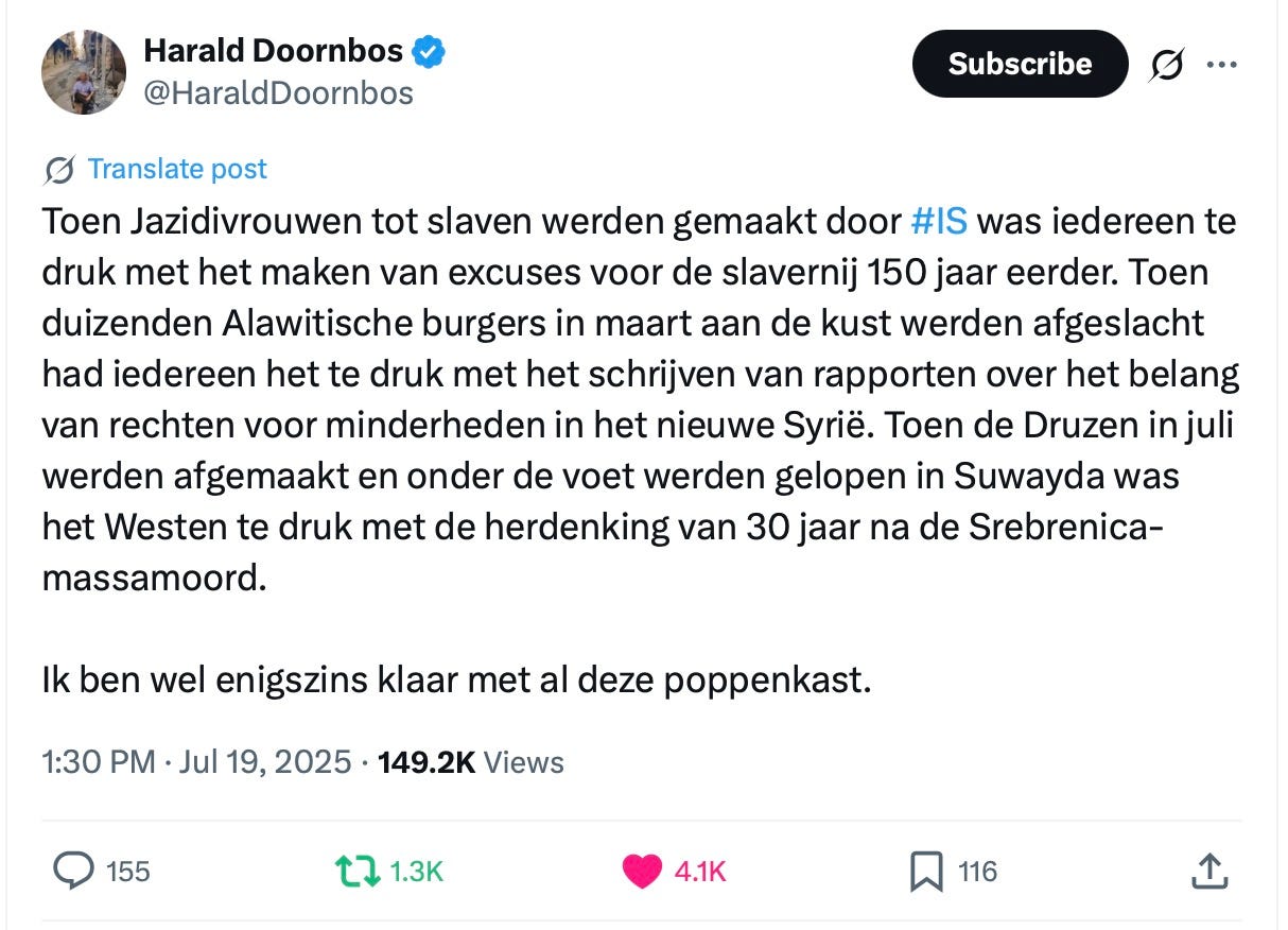 Wat Syrië betreft is het wellicht ook nog het vermelden waard dat Syriërs in Duitsland ook Druzen wilden aanvallen, dat er mogelijk een Syrische influencer uit Nederland bij het geweld in Sweida betrokken is en dat het ook in het zuiden van Syrië net als in Gaza kennelijk gewoontegebruik is om een persvestje aan te trekken als je eigenlijk een terrorist bent.