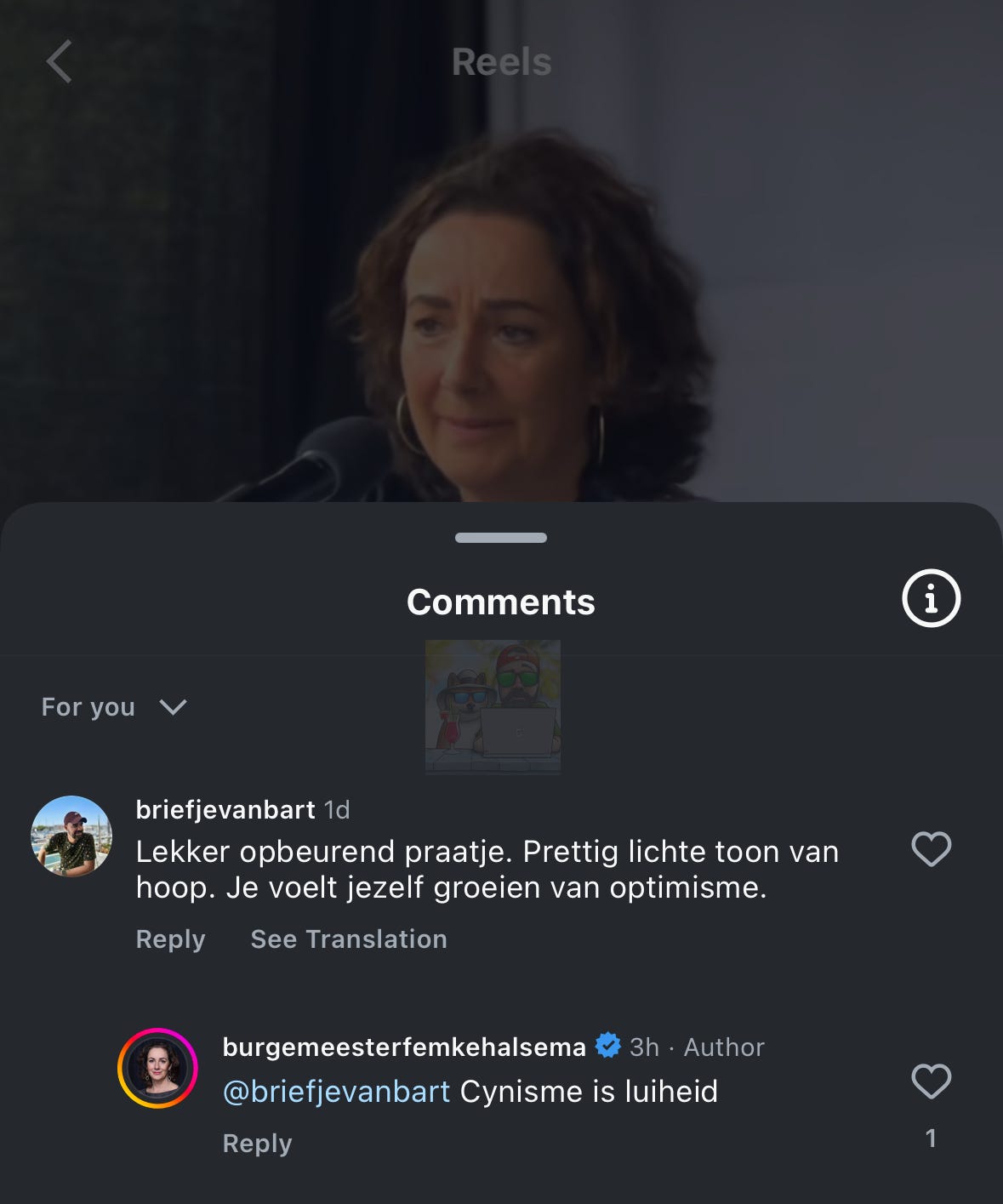 Doomscrollend over Insta kon ik een sarcastisch commentaartje niet onderdrukken: ‘Lekker opbeurend praatje. Prettig lichte toon van hoop. Je voelt jezelf groeien van optimisme’, reageerde ik. Maar omdat Halsema ook altijd onverbeterlijk zichzelf zal zijn, reageerde ze daarop. Uit de heup: ‘Cynisme is luiheid’.