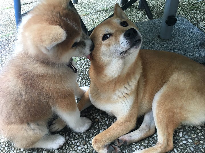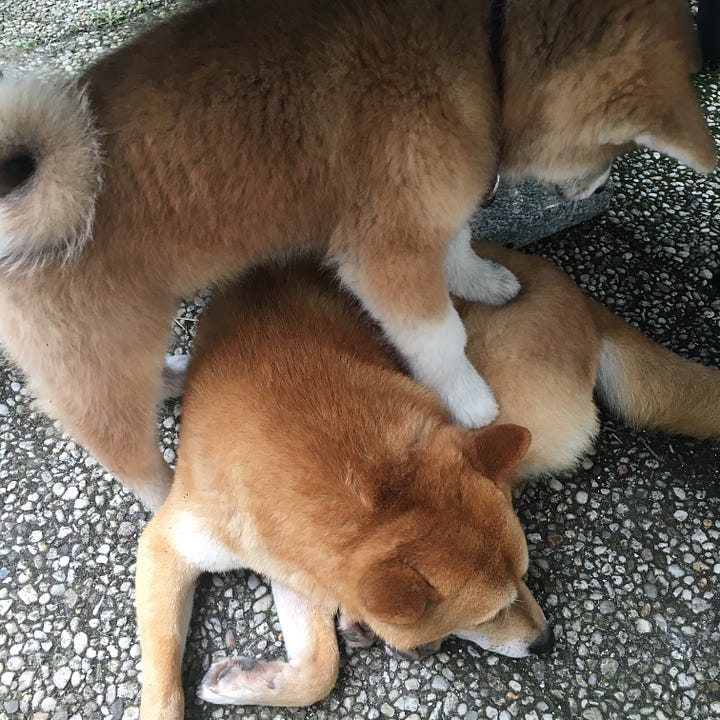 Smuk werd haar harige schaduw en - in weerwil van de reputatie van het ras en haar onhandelbare hondenpuberteit - ook nog eens een vreselijk lieve floof. Nooit heb ik haar ook maar de geringste dreiging richting mensen zien uiten, behalve die ene keer dat ze met een hele diepe, lage grom een man die opvallend traag achter Dieuwertje bleef fietsen tot grote versnelling maande. Agressie naar andere honden (nog zo’n akita-stereotype) had ze hooguit in haar jongste jaren. Meestal dwong ze zonder geweld het gezag wel af.