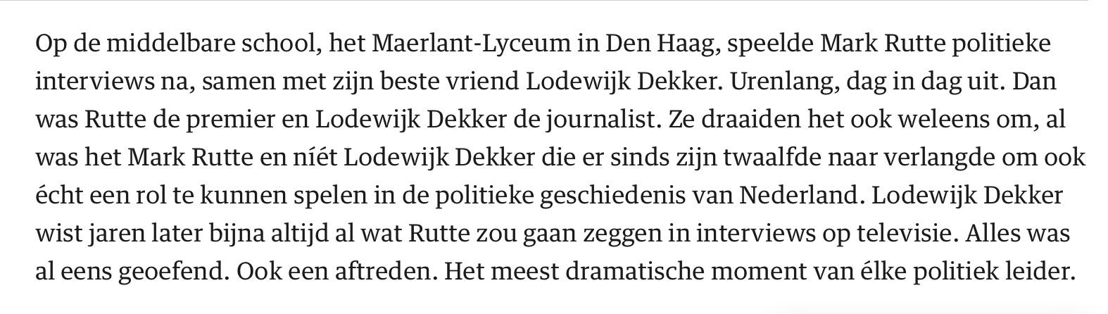 Vervolgens mocht ik kiezen welke van de twee in het blad wordt afgedrukt deze week en welke alleen online verschijnt. Bovenstaande cursiefje staat op papier, onderstaande alleen online en ik was wel blij toe ook, want de alinea in onderstaande Rutte-column die suggereert dat het vooral leed en grote crises waren die hem zo lang in het zadel hielden omdat ze voor hem op politiek opportune momenten kwamen, is misschien wat kort door de bocht.
