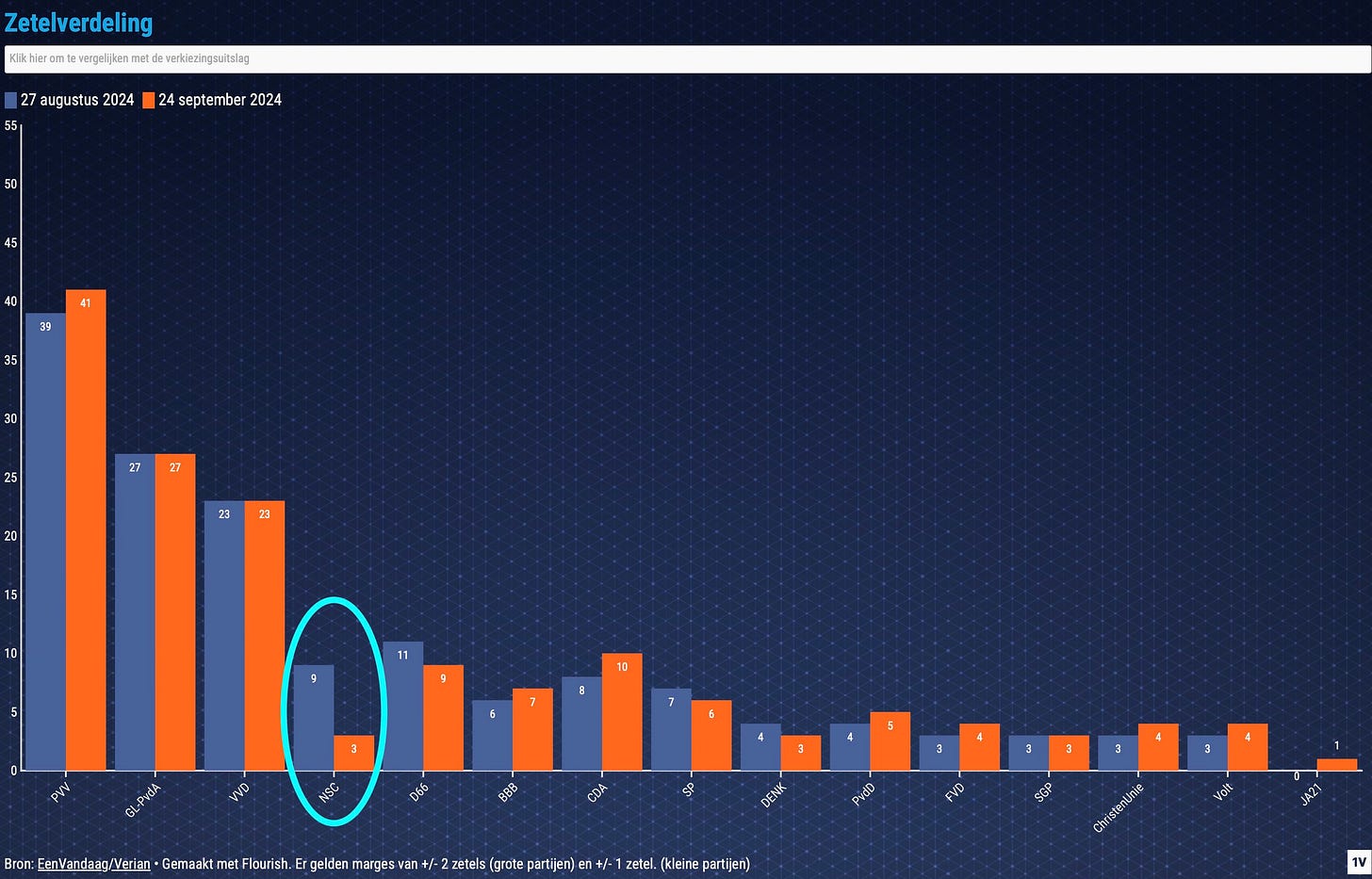 Vandaag laten nieuwe peilingen zien dat NSC dood in het water ligt (3 zetels…) terwijl de PVV blijft groeien (41). En in Den Haag staat de boel staat op scherp, nu al, in het kabinet Schoof, dat überhaupt geen echt kabinet is.